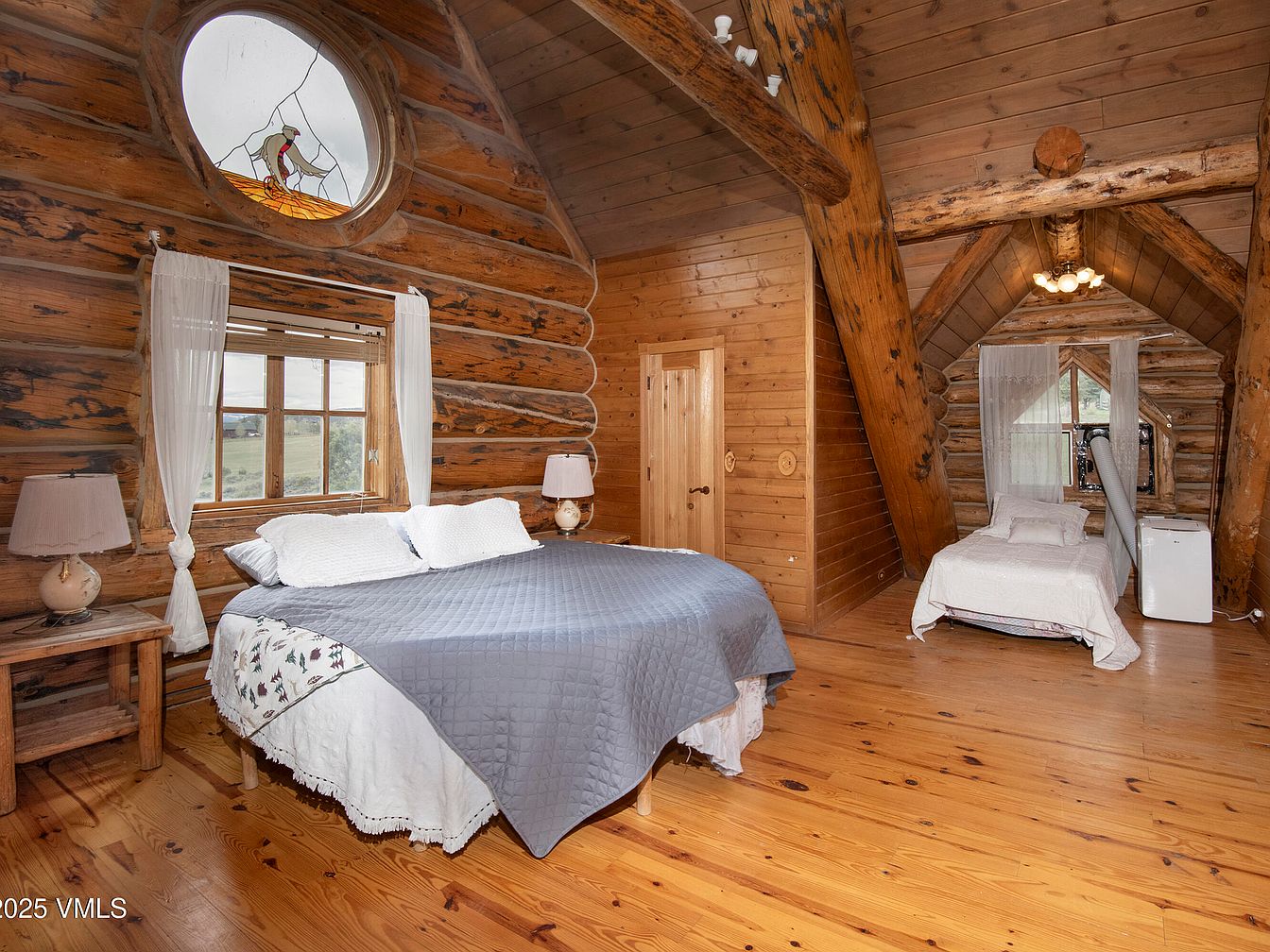 A cozy bedroom with rustic charm highlighted by log walls and a warm wooden floor. A large bed, adorned with a gray quilt and white lace trim, anchors the space. Adjacent, a smaller bed provides additional sleeping accommodations. Soft, sheer curtains frame the windows, allowing natural light to illuminate the room. A round stained-glass window adds a unique touch, casting colorful patterns. Wooden furniture accompanies the beds, including a nightstand with a classic lamp. The high, sloped ceiling showcases exposed beams, enhancing the room’s inviting atmosphere, while the overall color palette of earthy tones promotes tranquility.