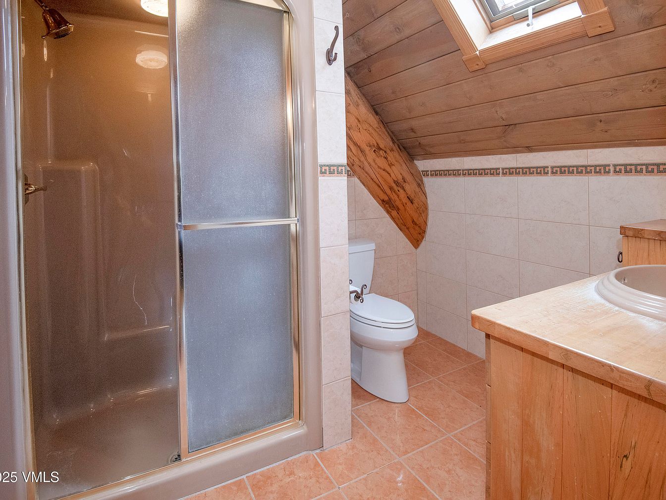 The bathroom features a compact layout with a corner shower unit glimmering under soft lighting. Natural wood accents, including the slanted ceiling and exposed beams, create a warm atmosphere. White ceramic tiles line the lower walls, contrasting with the rich wooden tones, while decorative tile borders enhance visual interest. A wooden vanity with a circular sink integrates functionality and rustic charm, providing ample storage below. A white toilet complements the fixtures, ensuring a clean aesthetic. The skylight above illuminates the space, blending natural light with the warm hues, making the bathroom both inviting and practical.