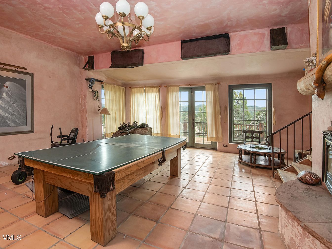 This spacious game room features a unique blend of rustic and relaxed aesthetics. The walls are adorned with a soft, peachy plaster finish, complemented by terracotta floor tiles that add warmth to the space. An oversized wooden ping pong table occupies the center, surrounded by casual seating options. Large windows draped with sheer light curtains allow natural light to flood in, creating an inviting atmosphere. The ceiling boasts a circle chandelier with multiple globes, providing ambient illumination. Architectural details include a charming staircase leading to another level and decorative art pieces that enhance the room’s character.