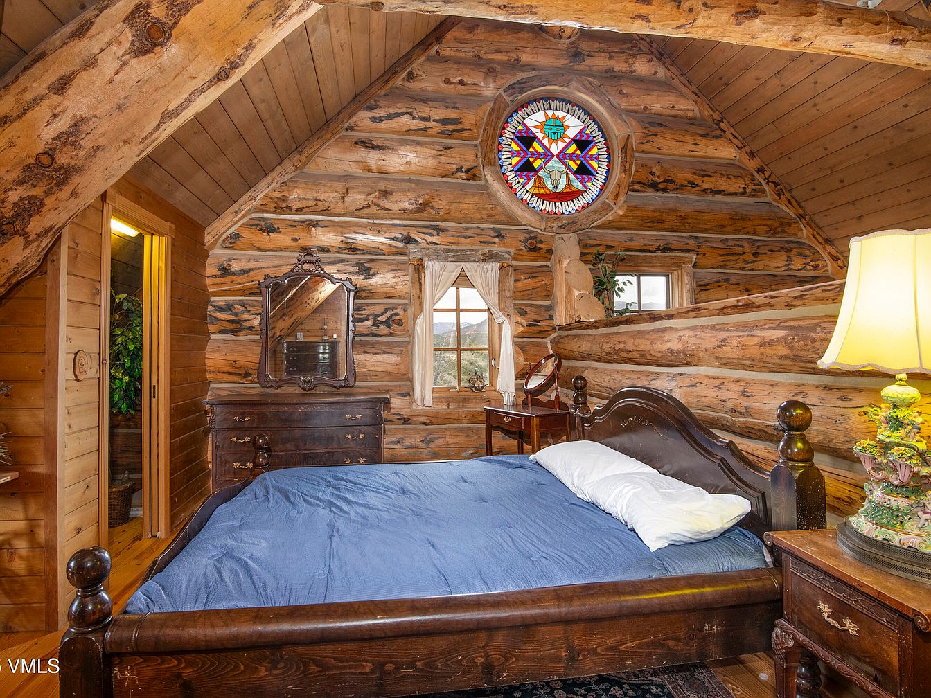 A warm, rustic bedroom featuring exposed wooden logs as walls, creating a cozy cabin ambiance. The sloped ceiling is adorned with the same natural wood, enhancing the homey feel. A large bed with a dark wooden frame and a blue quilted blanket serves as the focal point. Opposite the bed, a vintage dresser with an ornate mirror reflects natural light from a nearby window, framed by soft white curtains. A small wooden table holds a decorative lamp with intricate details. A circular stained glass window adds a splash of color and a unique touch, complementing the earthy tones of the space.