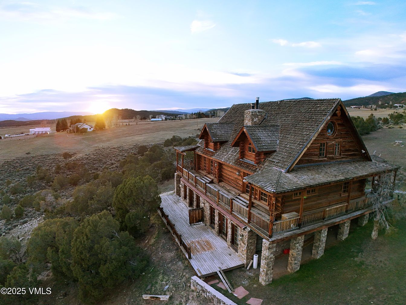 A grand wooden home with rustic charm sits elevated on stone pillars, showcasing its sprawling deck. It features a combination of dark-stained logs and stone, creating a warm, natural aesthetic. The steeply pitched roof is adorned with shingles, while multiple gabled sections provide architectural interest. Large windows reflect the setting sun, casting a golden glow over the landscape. Surrounding the house, a lush green setting offers a view of rolling hills and distant mountains, enhancing the serene atmosphere. The outdoor space invites reflection, with ample room for gatherings amid the breathtaking vistas of nature.