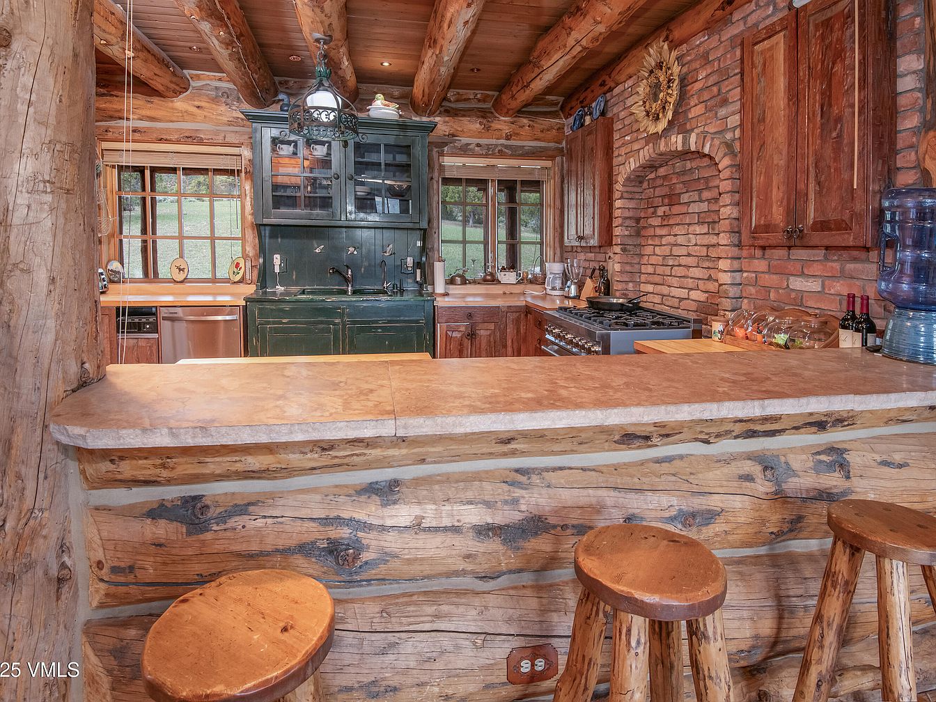 This kitchen features a rustic aesthetic with exposed wooden beams and a stone-like bar countertop. The cabinetry is dark green, contrasting beautifully with the warm, reddish-brown brick walls, which add a cozy, historic charm. A vintage-style gas range sits prominently, complemented by wooden cabinetry and countertop appliances. Natural light floods the space through multiple windows, highlighting the organic textures of the log framework. Bar stools made from thick, round wood provide casual seating at the counter. Details like a decorative wreath and vintage dishware enhance the inviting, homey atmosphere, ideal for gathering and culinary creativity.
