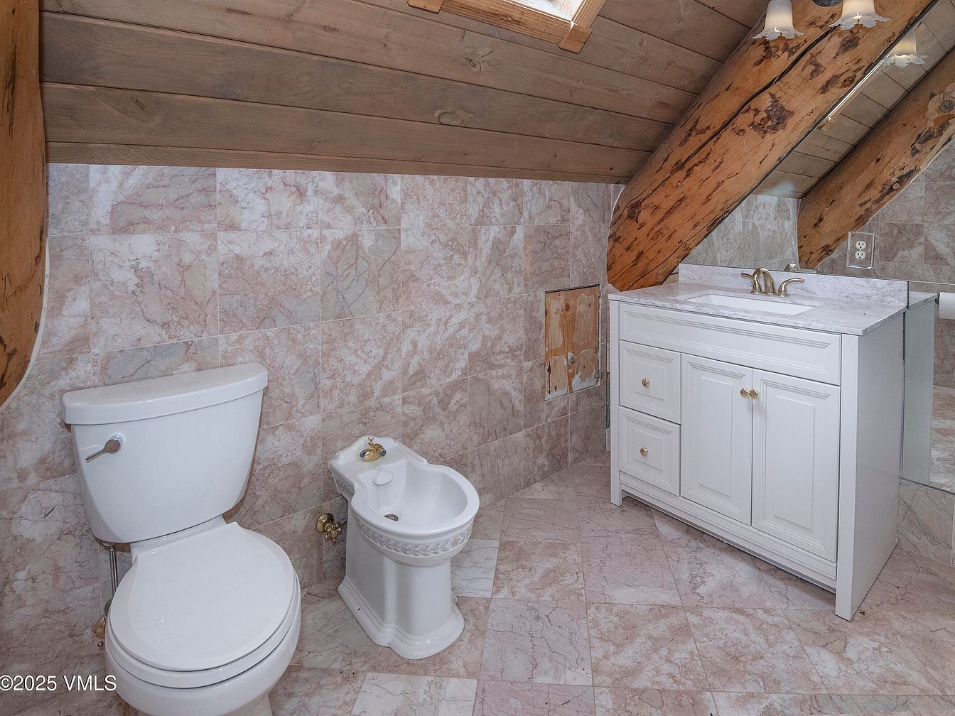 A rustic bathroom with sloped wooden ceilings and exposed beams creates a warm, inviting atmosphere. The walls are adorned with elegant marbled tiles in soft pink hues, complementing the serene aesthetic. A modern white vanity with gold fixtures enhances functionality, featuring two drawers for storage. Adjacent, a classic white toilet and a bidet, both in porcelain, integrate seamlessly into the design. Light filters in through a small skylight, adding a touch of brightness. This secluded space harmoniously blends contemporary elements with historic charm, making it a cozy, personal retreat within the home.