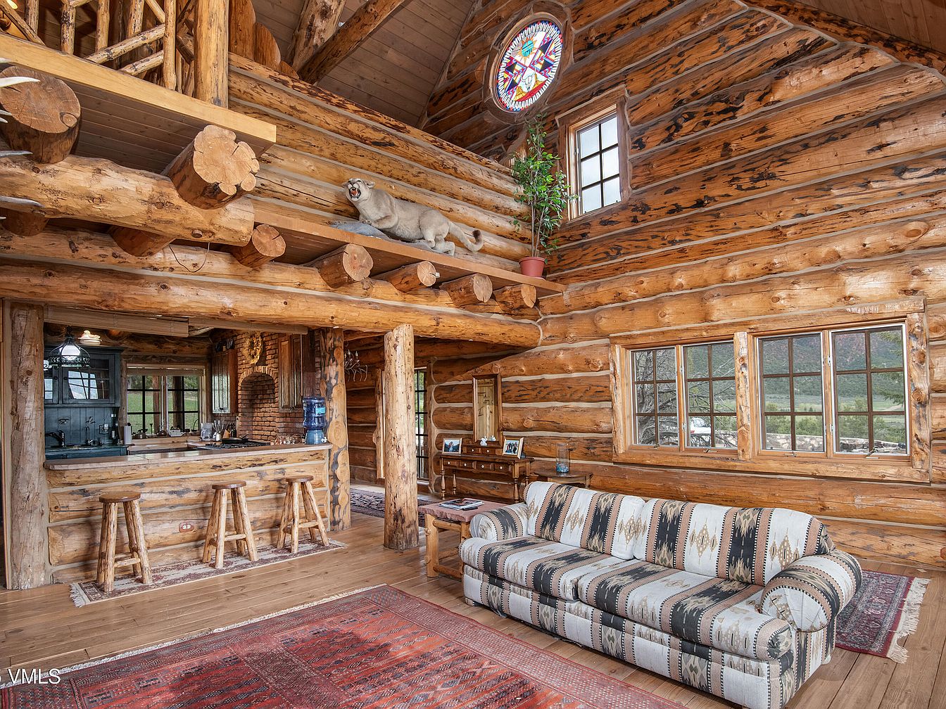 A rustic living room featuring exposed log beams and warm wooden walls, creating a cozy ambiance. The furniture includes a patterned, overstuffed sofa with a tribal design, complemented by a textured area rug that adds warmth underfoot. A sleek bar area made of log supports showcases a dark countertop and rustic stools. Large windows fill the space with natural light, revealing views of the outdoors. A striking stained-glass window hangs overhead, adding a colorful focal point. The mixture of natural materials and earthy colors embraces a cabin aesthetic that enhances the room’s inviting atmosphere.