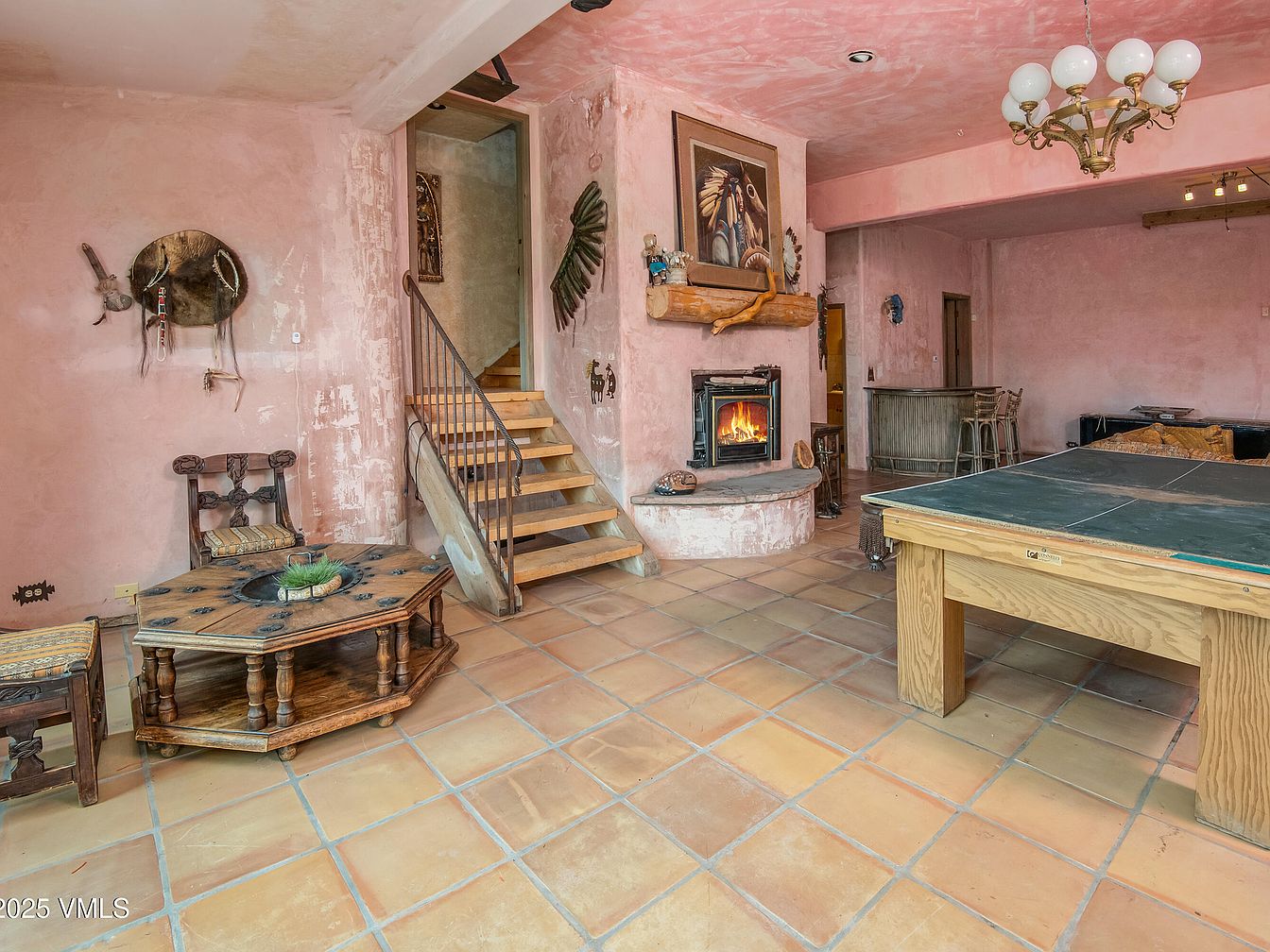 This cozy living room features a rustic aesthetic with soft pink plaster walls, creating a warm atmosphere. A circular wooden coffee table with intricate carvings sits in the center, surrounded by a wooden chair and a casual seating area. The room showcases a charming fireplace nestled within a stone base, drawing attention to the flickering flames. An ornate chandelier hangs above, providing soft lighting, while a staircase with wooden steps leads to an upper level. Decorative elements include Native American-inspired artifacts on the walls, enhancing the cultural vibe, and a tiled floor adds an earthy charm to the space.