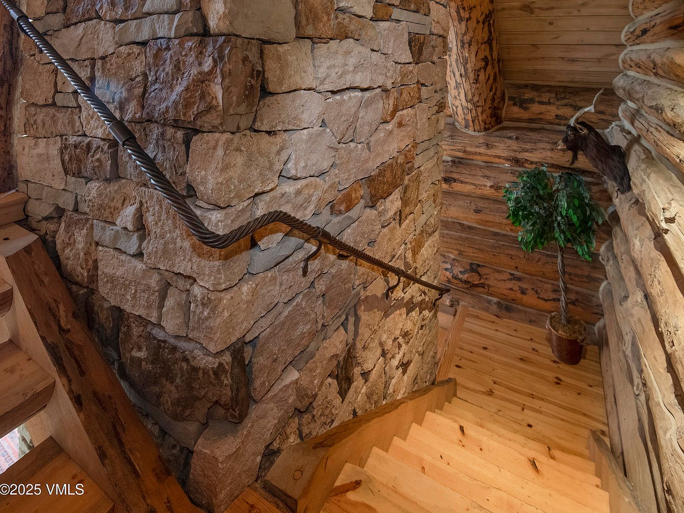 A rustic staircase leading down through a warm, inviting wood and stone corridor. The walls are adorned with large, rough-hewn stones that contrast beautifully with the smooth wooden logs above. A metal railing, crafted with a twisting design, adds an artistic flair while ensuring safety. Light filters in through an unseen source, highlighting the natural hues of the wood and stone. The wooden stairs, with their soft, light finish, invite movement downward, while a potted faux plant enhances the organic feel of the space. This area exudes a cozy, mountainous aesthetic, blending natural materials harmoniously.