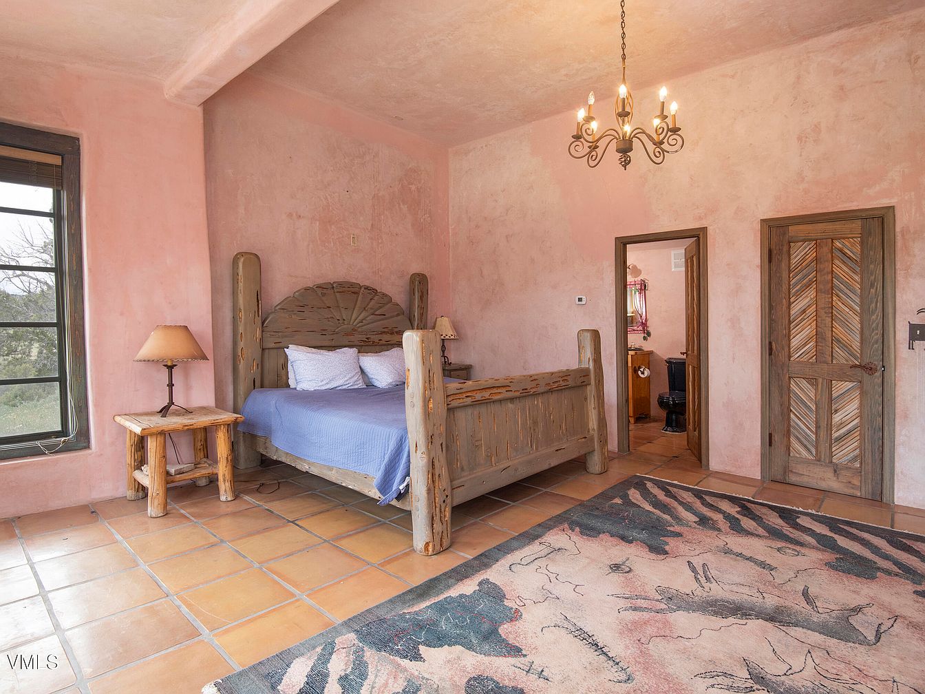 This rustic bedroom features soft pink walls and warm terracotta tile flooring, creating a cozy atmosphere. A wooden bed frame, crafted from rough-hewn logs, serves as a focal point, showcasing an intricately designed headboard. Crisp white bedding contrasts beautifully with a blue blanket draped over the bed. Beside the bed, a simple wooden nightstand holds a warm-toned lamp, complementing the natural elements found throughout the room. The doors leading into the adjoining space feature unique wood patterns, adding character. Large windows offer natural light and scenic views, enhancing the room’s inviting and serene aesthetic.