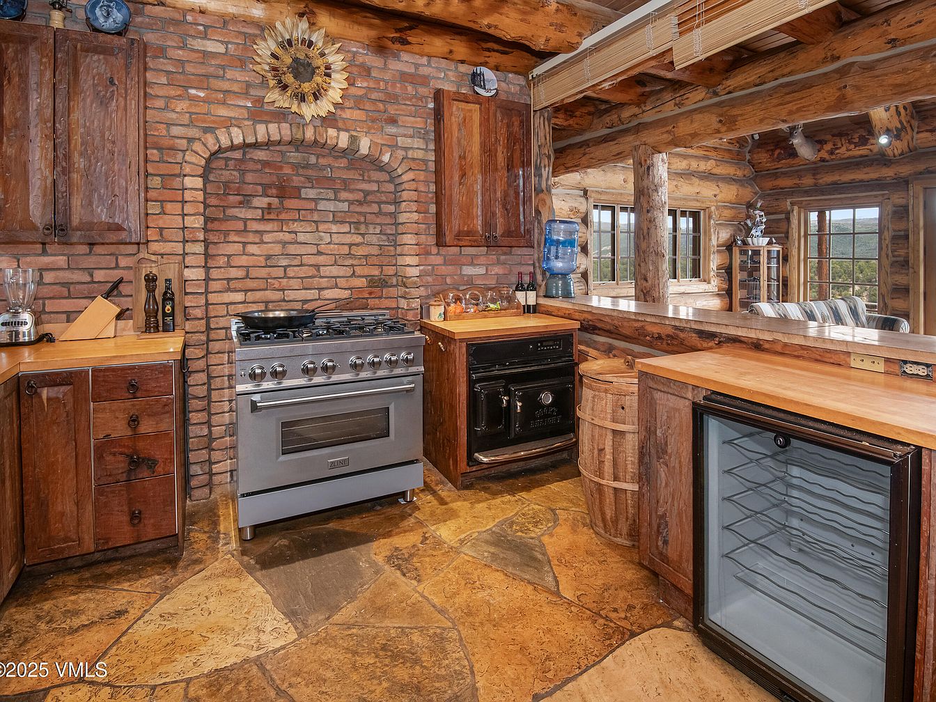 This rustic kitchen features a blend of traditional and functional elements. Exposed brick walls create an earthy backdrop, complemented by dark wooden cabinetry with intricate textures. A professional-grade stainless-steel stove sits in a brick alcove, emphasizing both style and utility. The counters are made of natural wood, adding warmth, while a stone floor provides durability and enhances the rustic feel. The space is illuminated by natural light from nearby windows, accented by log beams that exhibit craftsmanship. A small bar area offers modern convenience, with a wooden barrel adding a charming, country touch.