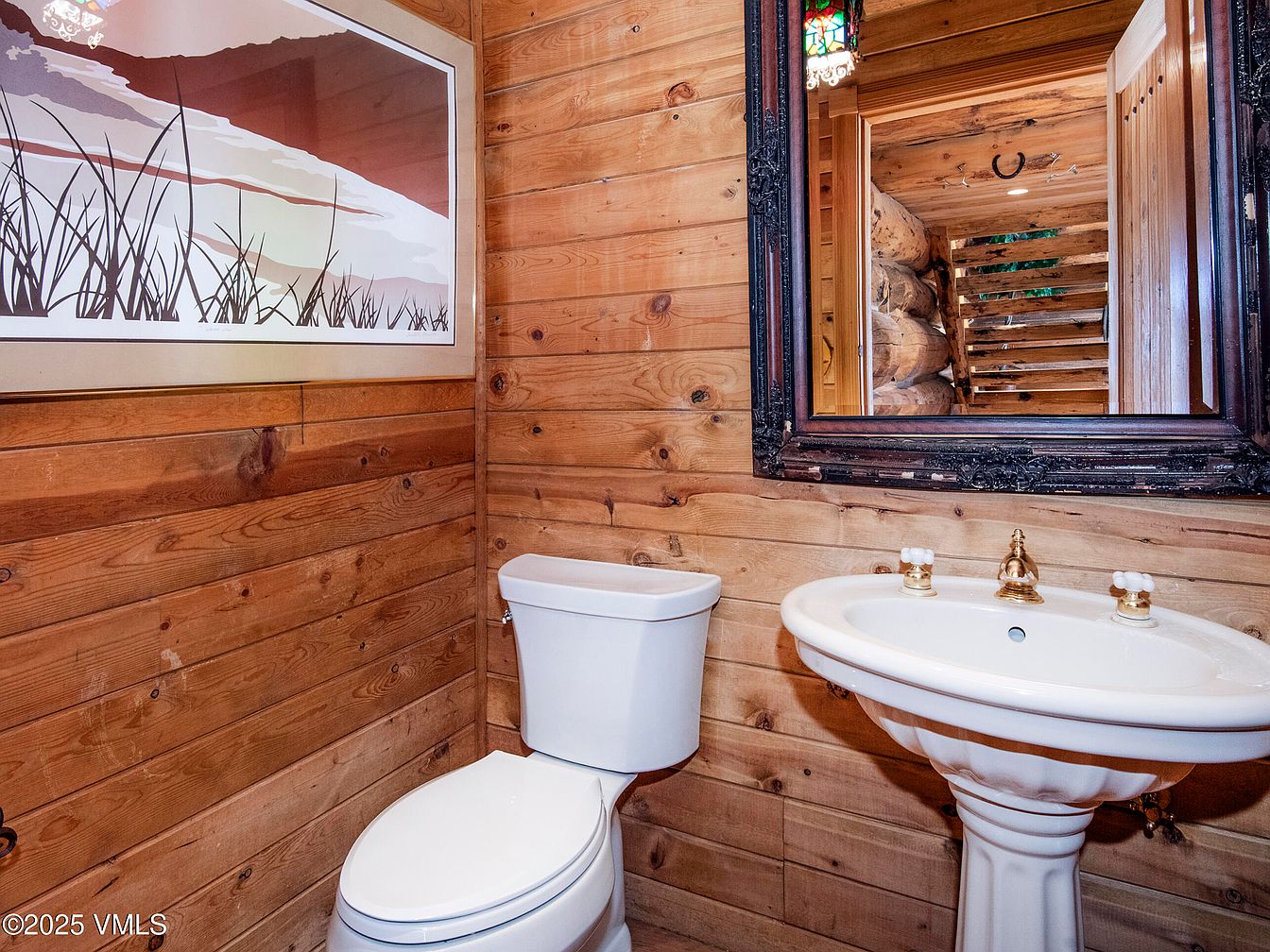 Rustic bathroom features warm wooden paneling that creates a cozy and inviting atmosphere. A vintage-styled porcelain sink with ornate gold fixtures and a matching commode provide elegance. The sink is set against the wooden wall, with a large, ornate framed mirror that enhances the room’s charm. Above the sink, a colorful artwork depicting soft, natural scenery adds a touch of vibrancy. The room is illuminated by a stained glass light fixture, casting colorful reflections. The architectural elements reflect a blend of rustic charm and classic design, creating a tranquil retreat within the home.