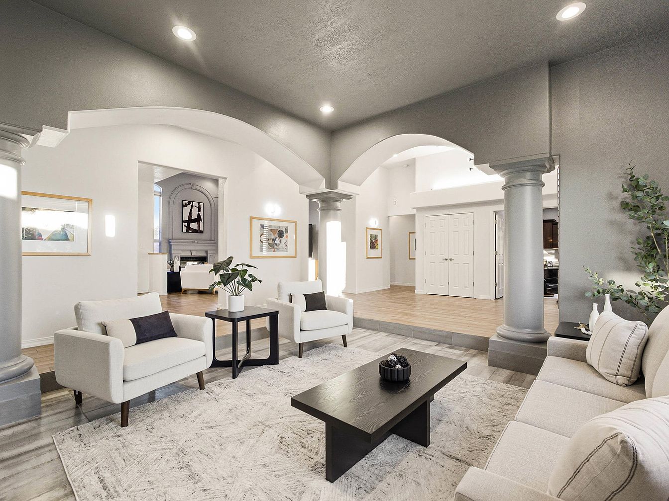 A spacious living room characterized by an open layout, featuring elegant arches supported by stylized columns. The color scheme blends soft greys and whites, enhancing the airy ambiance. Two contemporary armchairs and a couch provide comfortable seating, accented with dark cushions. A minimalist black coffee table, adorned with decorative items, centers the seating area. A large, textured area rug anchors the space, adding warmth. Subtle wall art complements the modern aesthetic, while natural light floods in through adjacent windows, illuminating the polished wooden flooring and enhancing the inviting atmosphere of this stylish gathering area.