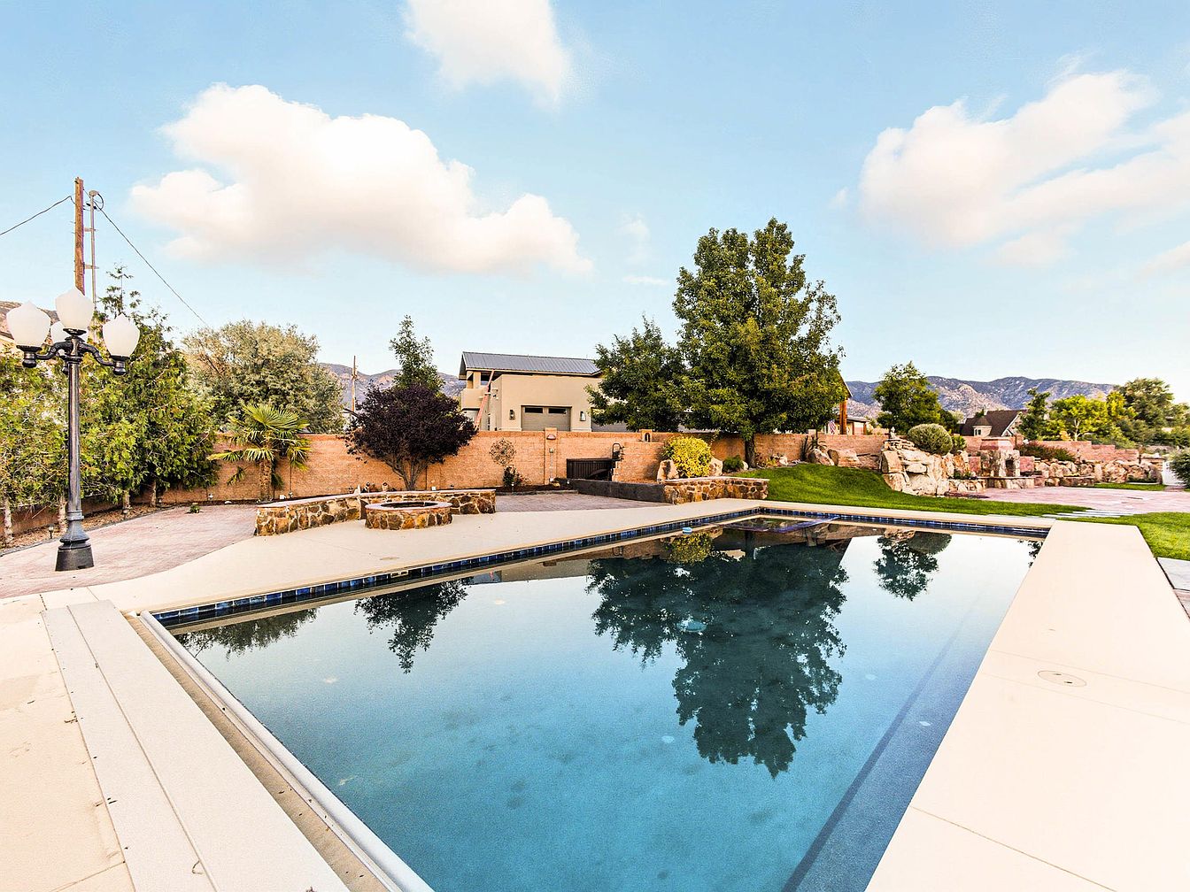 The scene showcases a serene backyard featuring a large, pristine pool that reflects the surrounding greenery. The pool is bordered by a sleek, light-colored stone deck, inviting relaxation. A rustic stone fire pit sits prominently, providing a warm gathering spot. Lush trees and shrubs line the perimeter, adding a natural feel to the space. Soft clouds drift in a pale blue sky, enhancing the tranquil atmosphere. Background structures hint at additional outdoor amenities, and the landscape includes gentle slopes, integrating natural rock formations, harmonizing with the vibrant greenery. Overall, it conveys an inviting, recreational outdoor retreat.