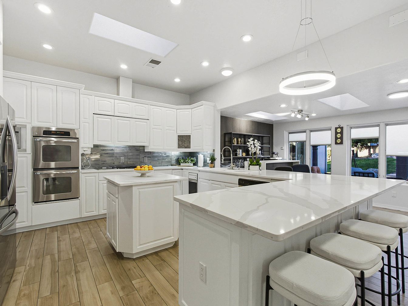 This modern kitchen features an open layout with a large island at its center, perfect for meal preparation and casual dining. The cabinetry is pristine white, contrasting beautifully with the sleek gray backsplash and stainless steel appliances, adding a touch of sophistication. A quartz countertop enhances the island’s appeal, while four barstools provide seating. Ample recessed lighting and a circular pendant light illuminate the space, creating a bright and inviting atmosphere. The hardwood floor extends throughout, offering warmth. Large windows invite natural light, revealing glimpses of the outdoor area, enhancing the overall spacious feel and connection to nature.