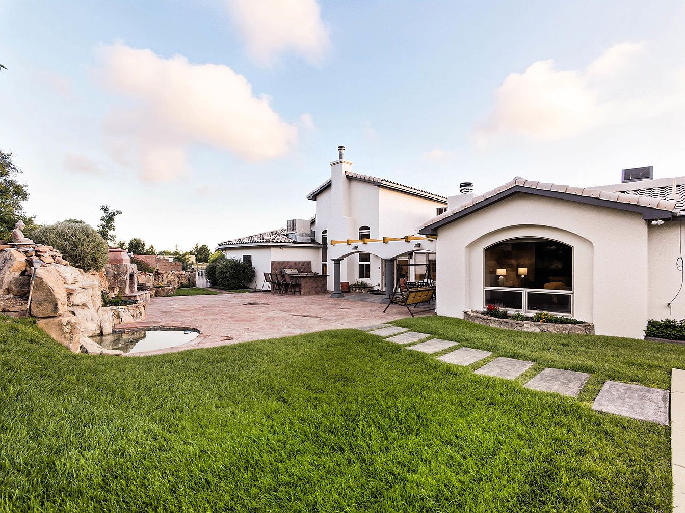 The backyard reveals a spacious outdoor area, featuring lush green grass and a beautifully landscaped garden. Natural stone elements create a textured border around a small pond, reflecting the clear sky. The house, with its smooth white exterior, hosts multiple windows that allow for ample natural light. Comfortable outdoor seating is arranged on a flagstone patio, ideal for relaxation. A small dining set, positioned near the house, offers a quaint setting for outdoor meals. The gentle slope of the yard adds depth, while strategically placed boulders enhance the organic feel of this inviting space.