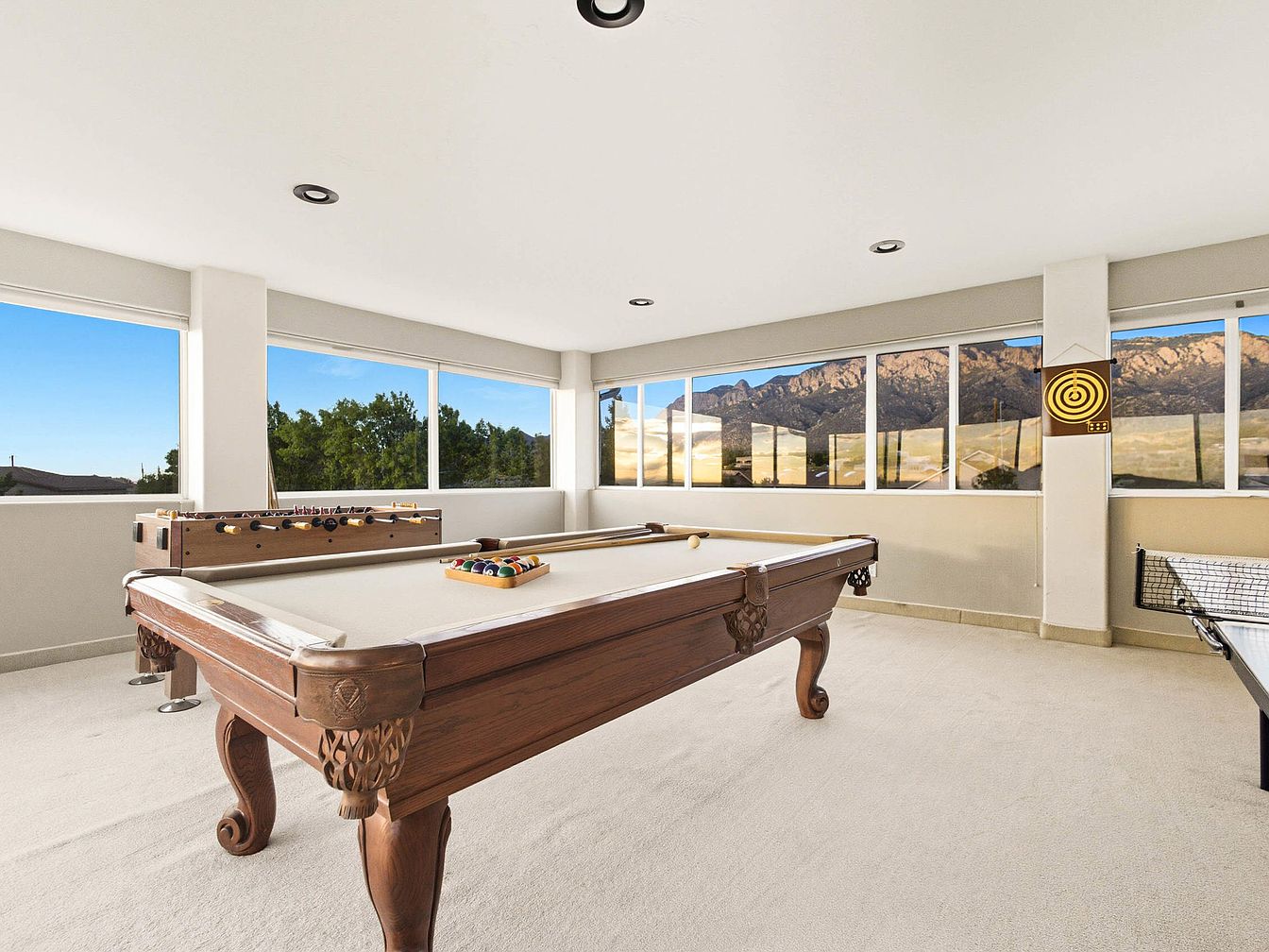 A spacious game room featuring a billiard table with ornate wooden legs and a beautifully crafted finish. Adjacent is a foosball table, adding a playful element to the space. The room boasts large windows that provide an abundance of natural light and showcase stunning mountain views, enhancing its appeal. The walls are painted in a soft neutral shade, harmonizing with the light-colored carpet that covers the floor. Recessed lighting fixtures in the ceiling offer bright illumination, while the overall layout promotes a inviting and recreational atmosphere, ideal for entertaining family and friends.