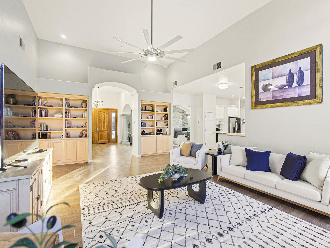 A spacious living room features high ceilings and a soothing light grey color scheme. The room is anchored by a stylish area rug with geometric patterns, complementing the modern aesthetic. Two white sofas adorned with navy blue pillows face a sleek black coffee table. Built-in wooden shelves host a collection of books and decor, adding warmth to the space. A large television is mounted opposite, creating a functional focal point. The entryway, visible in the background, showcases an elegant wooden door and archway leading to adjoining areas. Natural light pours in, enhancing the inviting atmosphere.