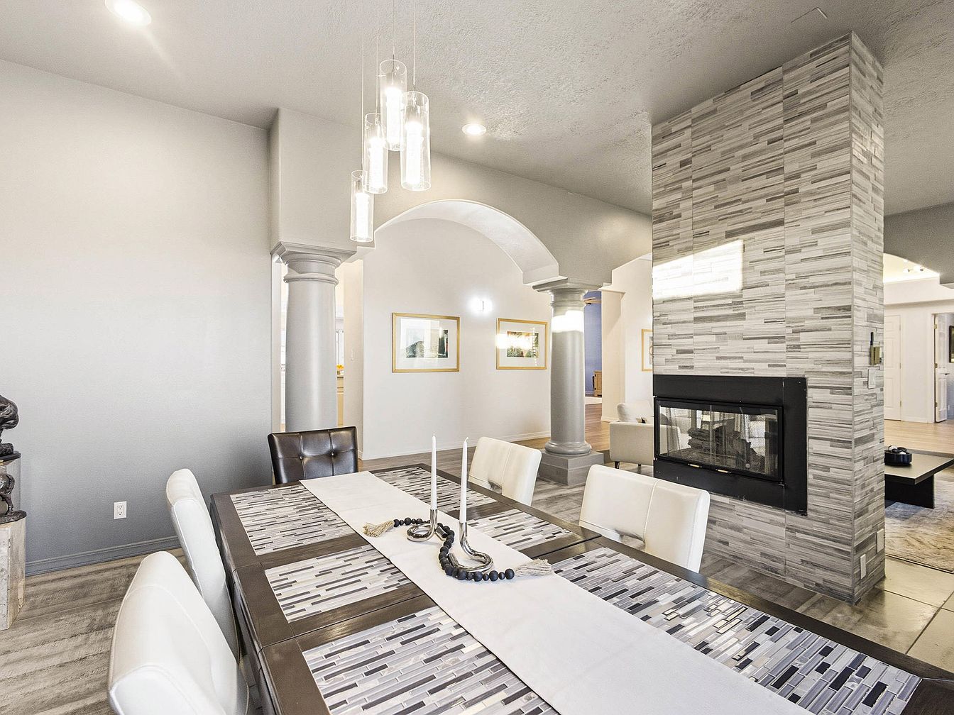 This dining area features a long, elegant table with a striking patterned table runner that emphasizes modern design. Surrounding the table are high-backed chairs, upholstered in sleek white, complementing the dark wooden table. A notable feature is the visually appealing stone fireplace against a wall adorned with textured gray tiles, providing a stylish focal point. Arches and columns enhance architectural interest, creating an inviting atmosphere. The soft lighting, accentuated by multi-tiered pendant fixtures, casts a warm glow, enhancing the serene ambiance. Neutral tones dominate the color palette, producing a sophisticated yet comfortable setting for gatherings.