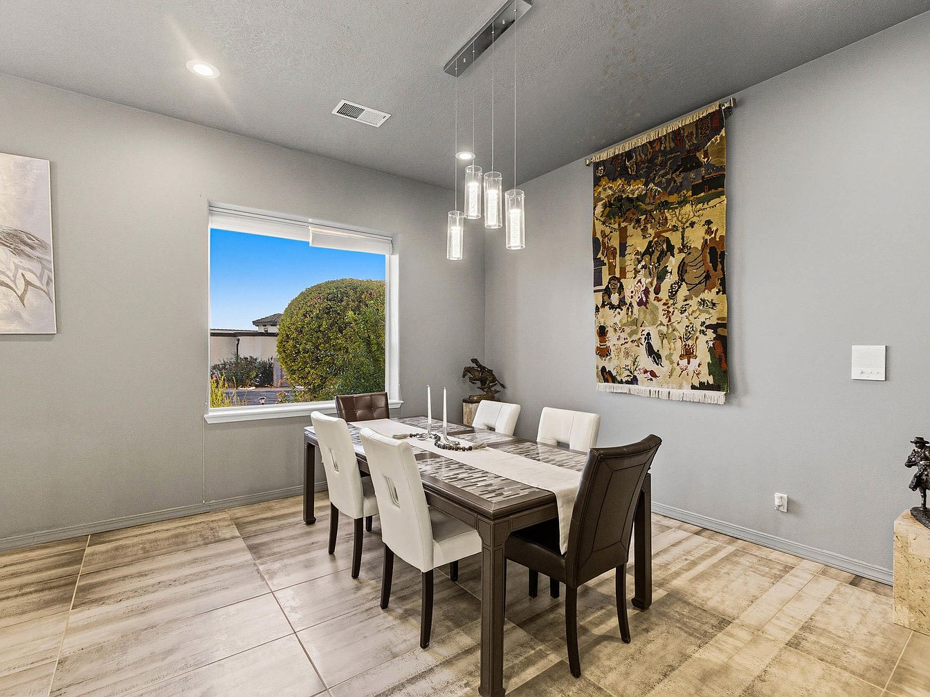 A modern dining room features a large rectangular table adorned with a textured table runner, complemented by sleek white and dark wood chairs. The walls are painted in a soft gray, enhancing the room’s airy feel. A large window invites natural light, revealing greenery outside, while a striking tapestry hangs adjacent, adding a touch of culture and warmth. Distinctive pendant lights hang above the table, providing focused illumination. The floor consists of large, textured tiles that resemble natural stone, seamlessly blending contemporary design with subtle elegance, punctuated by decorative elements like sculptures in the corner.
