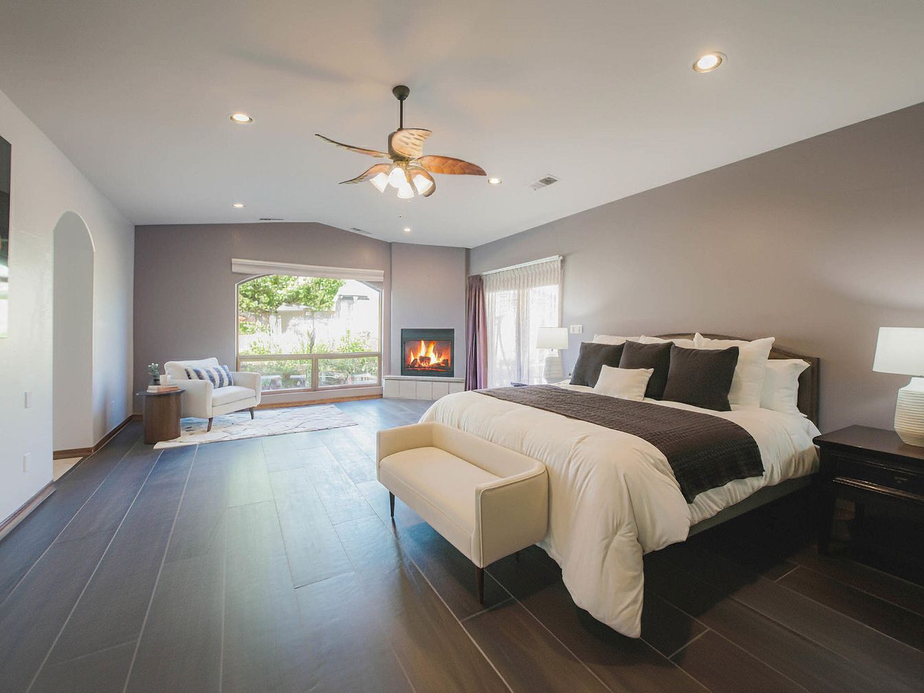 The bedroom is an inviting retreat characterized by soft, neutral tones of gray and white. The spacious layout includes a plush king-size bed adorned with an arrangement of decorative pillows, complemented by a light quilt. A modern light fixture with leaf motifs adds an organic touch, while recessed lighting enhances the ambiance. To one side, a cozy seating area features a stylish armchair and a contemporary wooden side table. A large bay window allows natural light to flood in, framing views of the garden. The sleek, dark wood flooring contrasts beautifully with the light walls, providing a warm, sophisticated atmosphere.