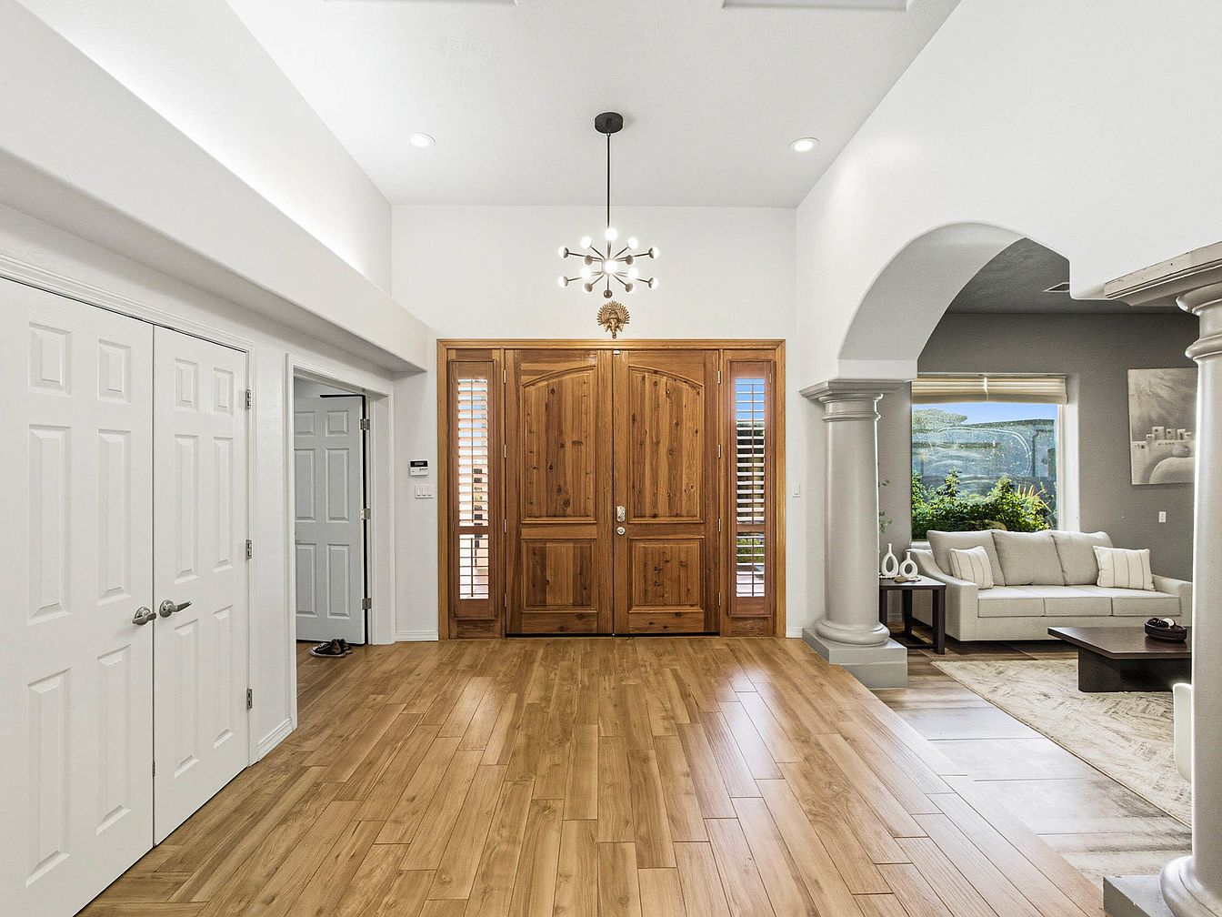 The entryway features a spacious and welcoming design, with rich wood double doors at the forefront, showcasing intricate details. Light hardwood floors add warmth and modernity, complemented by white walls that enhance brightness. On the right, a plush light gray sectional sofa offers comfort and style, set against a contrasting gray accent wall adorned with a minimalist artwork. Tall columns frame the entrance, adding an elegant architectural touch. Soft lighting from a contemporary chandelier provides ambient illumination, enhancing the inviting atmosphere. An adjacent window features lush greenery outside, connecting the indoor space with nature.