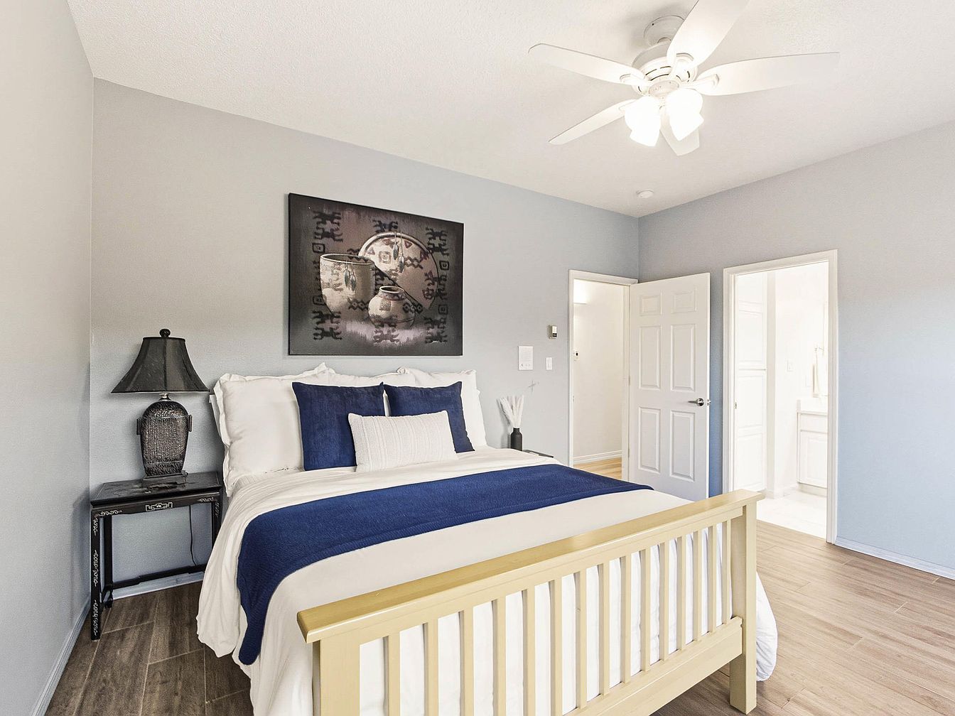 This bedroom features a calming aesthetic characterized by soft gray walls that create a serene atmosphere. A wooden bed frame, painted in a light color, is adorned with white bedding and a deep blue throw, enhancing the cozy feel. Two accent pillows in navy add a touch of color. A small black side table with an ornate lamp offers functional decor, casting a warm glow. The ceiling fan with multiple lights provides bright illumination. Two doorways lead to adjoining areas, while the flooring incorporates warm wooden tones, harmonizing the overall design and inviting relaxation.