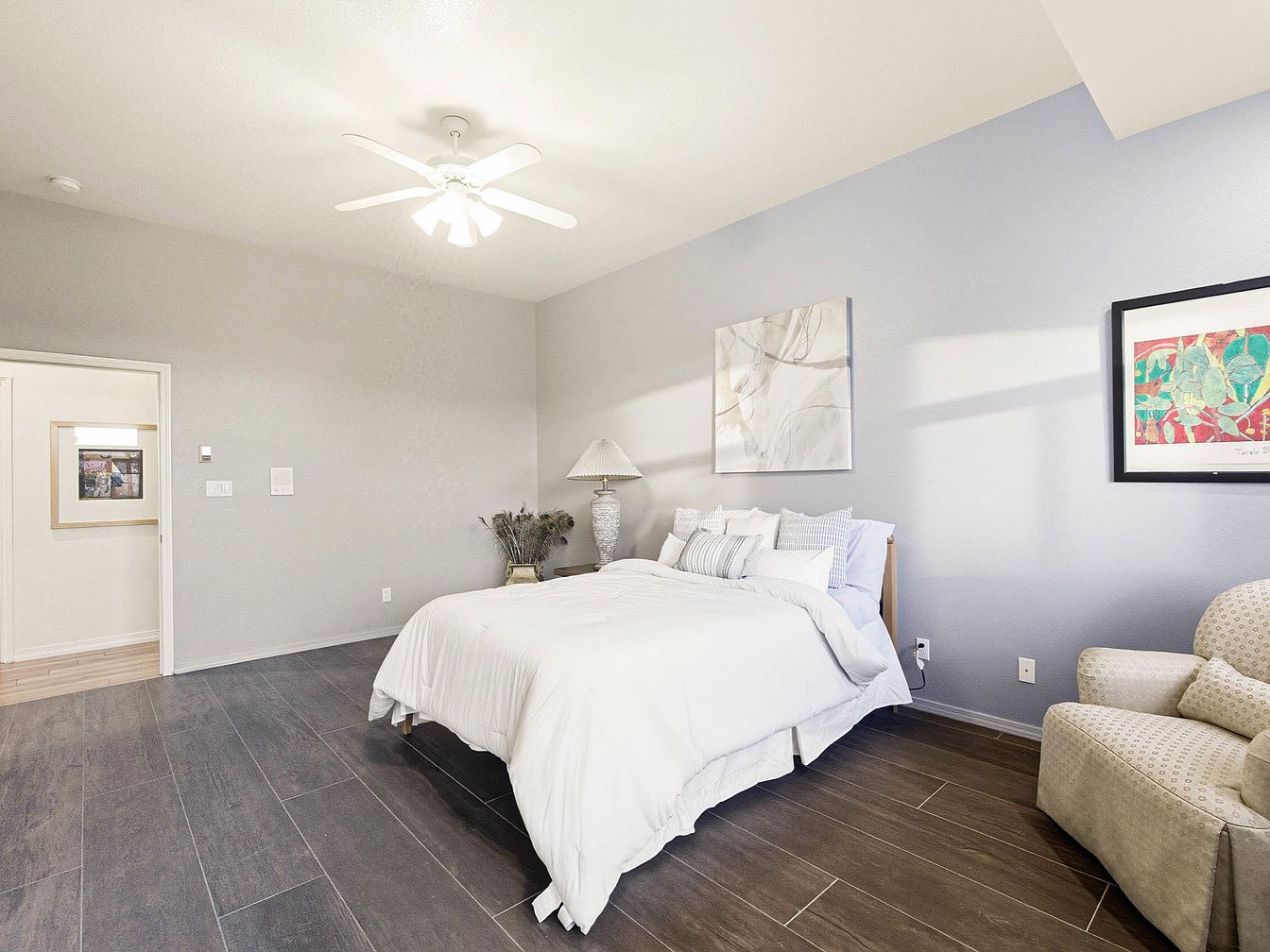 A spacious bedroom features a calming color scheme of soft gray walls and dark wooden flooring. The bed, dressed in crisp white linens, dominates the space, complemented by decorative pillows with subtle stripes. A stylish lamp sits atop a side table, enhancing the tranquility. Artwork adorns the walls, including a large abstract piece and a colorful print that adds a pop of character. Natural light streams through the room, highlighting the cozy armchair in a light fabric that provides a perfect reading nook. The overall aesthetic conveys a serene and modern atmosphere, inviting relaxation and comfort.
