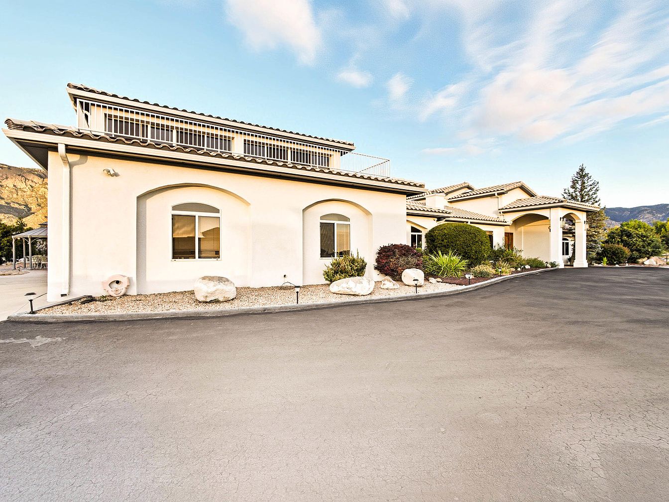 This exterior view showcases a modern American home, characterized by a clean, stucco façade in a soft beige hue. The structure features large, arched windows that allow ample natural light, flanked by tailored landscaping. Isolated rocks and low-maintenance shrubs offer a serene atmosphere, while a circular driveway leads visitors to the entrance. The roof is adorned with terracotta tiles, creating a warm contrast against the crisp lines of the architecture. A glimpse of a balcony hints at additional outdoor living space. The backdrop of gentle hills adds depth to the picturesque setting, creating an inviting ambiance.