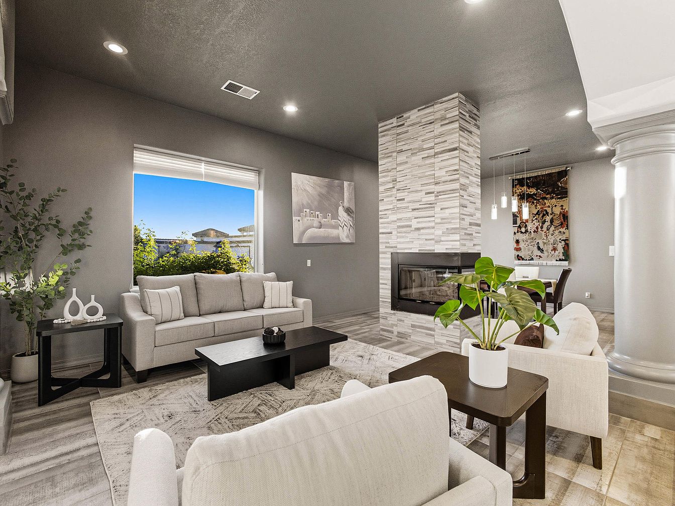 This modern living room features an open layout with a neutral color palette, accentuated by a soothing gray wall. A plush beige sectional sofa and upholstered chairs provide comfortable seating. A sleek black coffee table contrasts elegantly with the light-colored furniture. The flooring consists of large tiles that mimic natural stone, enhancing the room’s contemporary feel. A striking stone fireplace serves as a focal point, framed by large windows that invite natural light and offer views of greenery outside. Decorative elements include minimalistic vases and a subtle area rug, adding texture and warmth to the space.