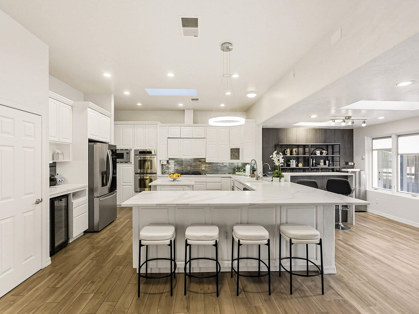 This modern kitchen features a spacious layout with sleek white cabinetry and stainless steel appliances. A large island with a light marble countertop serves as the centerpiece, complemented by four minimalist bar stools. The light wood flooring adds warmth, contrasting the clean lines of the cabinets. Ambient lighting from recessed fixtures and a contemporary pendant illuminates the space, creating a bright, inviting atmosphere. The backsplash showcases a subtle gray tile, enhancing the overall sophistication. A small dining area with a dark wood accent wall adds depth, while large windows allow natural light to flood the room.