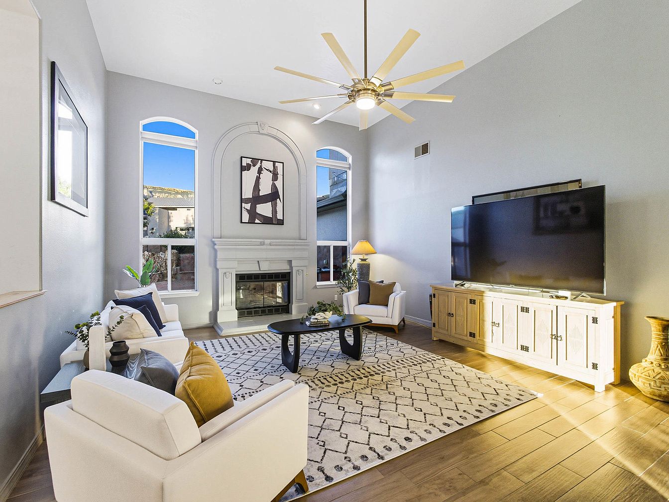 A cozy living room featuring high ceilings and large, arched windows that invite natural light. The color palette includes soft grays and whites, complemented by a warm wooden floor. Two plush white sofas are arranged around a circular black coffee table, adorned with decorative items. A striking abstract piece hangs above a classic white fireplace, adding elegance to the space. A large flat-screen TV is mounted on an oak cabinet with intricate detailing, while a floor lamp and a potted plant introduce warmth and life. An inviting patterned rug brings texture and comfort underfoot.
