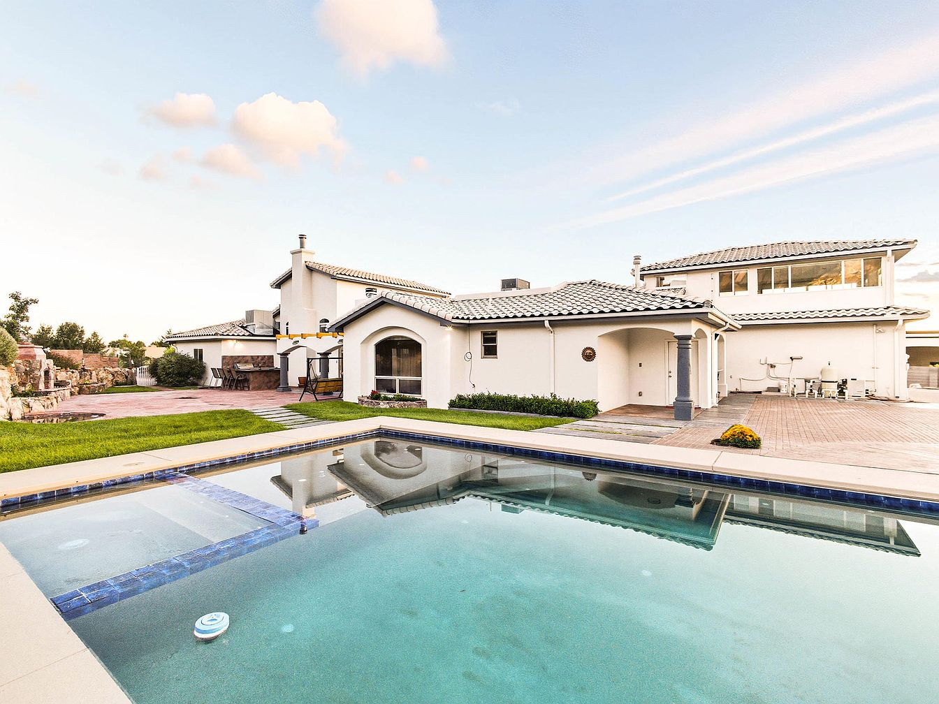 The scene captures a serene backyard, featuring a sparkling pool that reflects the evening sky. Lush green grass frames the water, while illuminated pathways guide toward the house. A cozy hot tub, lit with red accents, invites relaxation. Architectural elements include a slate-roofed structure with elegant arches and warm outdoor lighting enhancing the ambiance. The exterior walls are painted a soft cream, complementing the terracotta roof tiles. In the background, casual seating arrangements provide a perfect spot for gatherings. This tranquil outdoor space blends comfort with classic design, making it a perfect evening retreat.