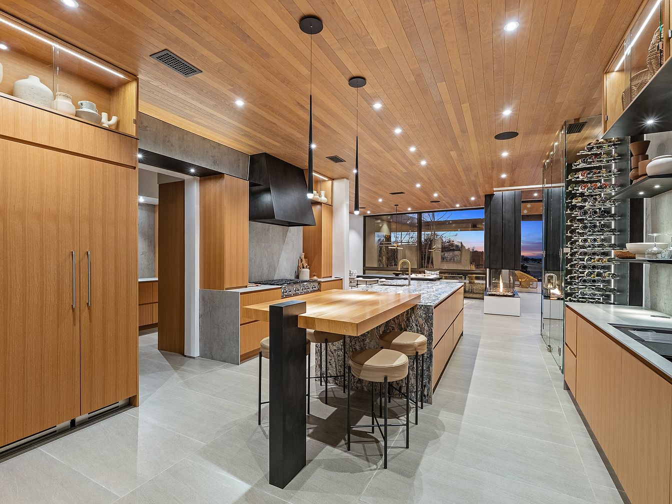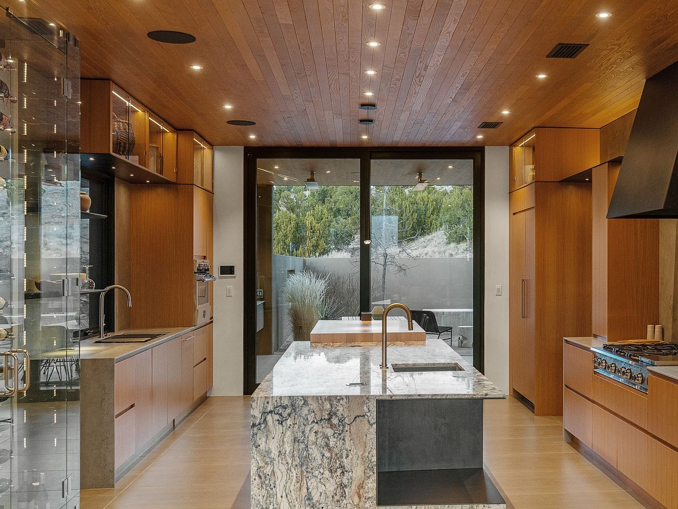 This contemporary kitchen features a blend of warm wood tones and sleek surfaces. Lush wooden cabinetry lines the space, highlighted by polished stone countertops with intricate patterns. A large island dominates the center, providing ample workspace and seating. Pendant lights hang elegantly above, adding to the ambiance. The ceiling boasts rich wooden paneling that enhances the warmth and richness of the space. Minimalist steel accents bring a modern touch, while the glass wall invites natural light and offers views of the outdoors. A wine rack adds a functional and stylish element, showcasing bottles neatly.