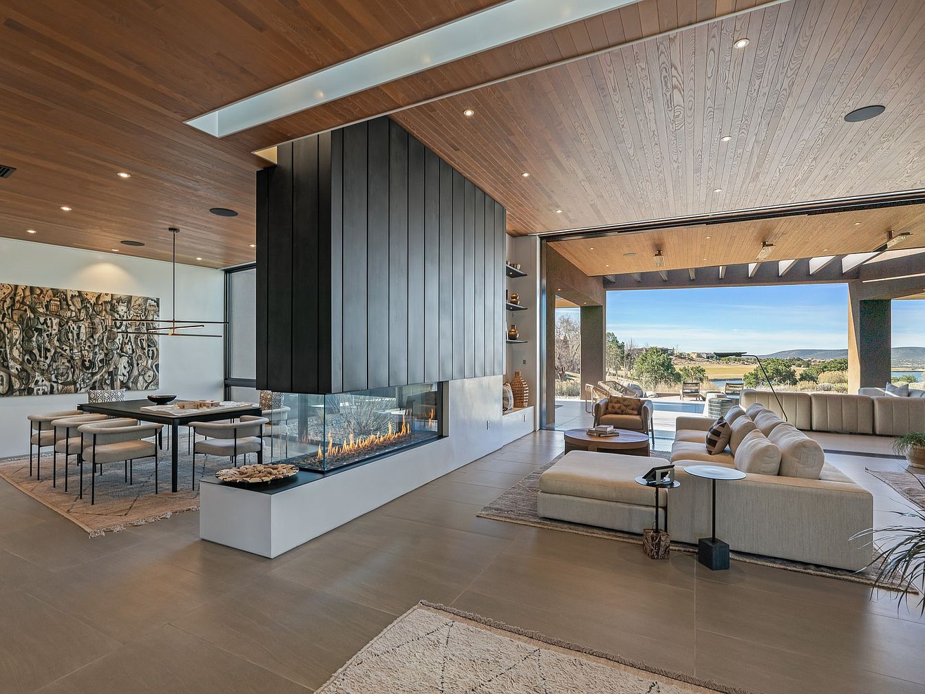 This open-concept living area features a striking suspended fireplace that divides the space elegantly. Natural wood ceiling beams complement the sleek black of the fireplace and modern furniture. A spacious dining area, furnished with muted, light-colored chairs surrounding a dark table, rests beside a large, abstract artwork that adds character to the wall. The flooring consists of large, light tiles, enhancing the airy vibe. A plush sectional couch invites relaxation, paired with a round coffee table that adds a cozy touch. Large glass doors open up to scenic views, seamlessly merging the indoor and outdoor spaces.
