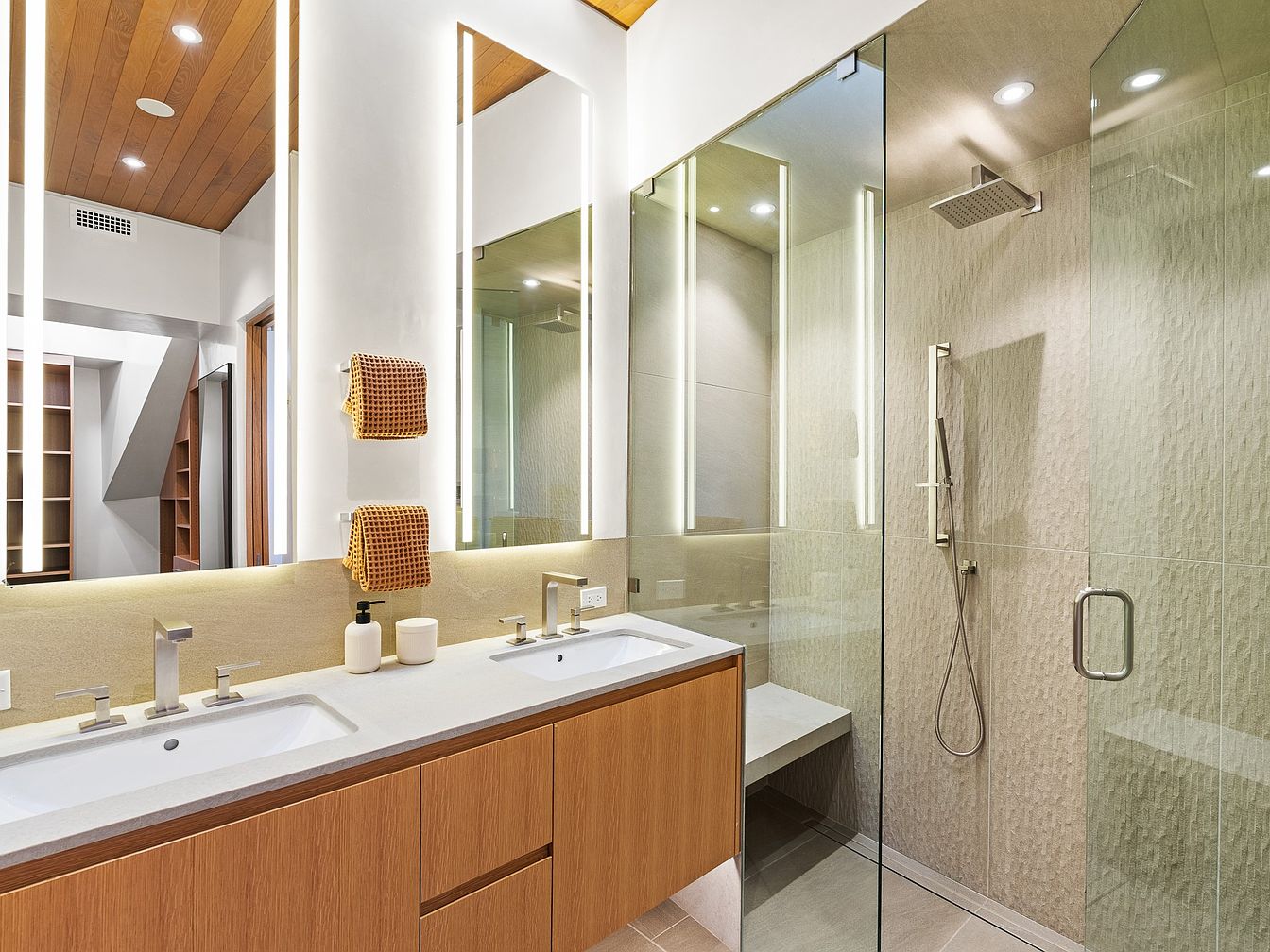This sleek bathroom features a minimalist design with a large dual vanity made from warm wood, complementing a light-colored countertop. The illuminated mirrors create an inviting glow along the walls. A glass-enclosed shower showcases textured tiles, enhancing the luxurious feel. Opposite the vanity, a built-in shelf area offers practical storage, seamlessly blending into the room’s lines. The ceiling, adorned with wooden panels, adds warmth and a touch of nature to the modern aesthetic. Bold, geometric shapes and soft tones establish a tranquil atmosphere, making this space both functional and stylish.
