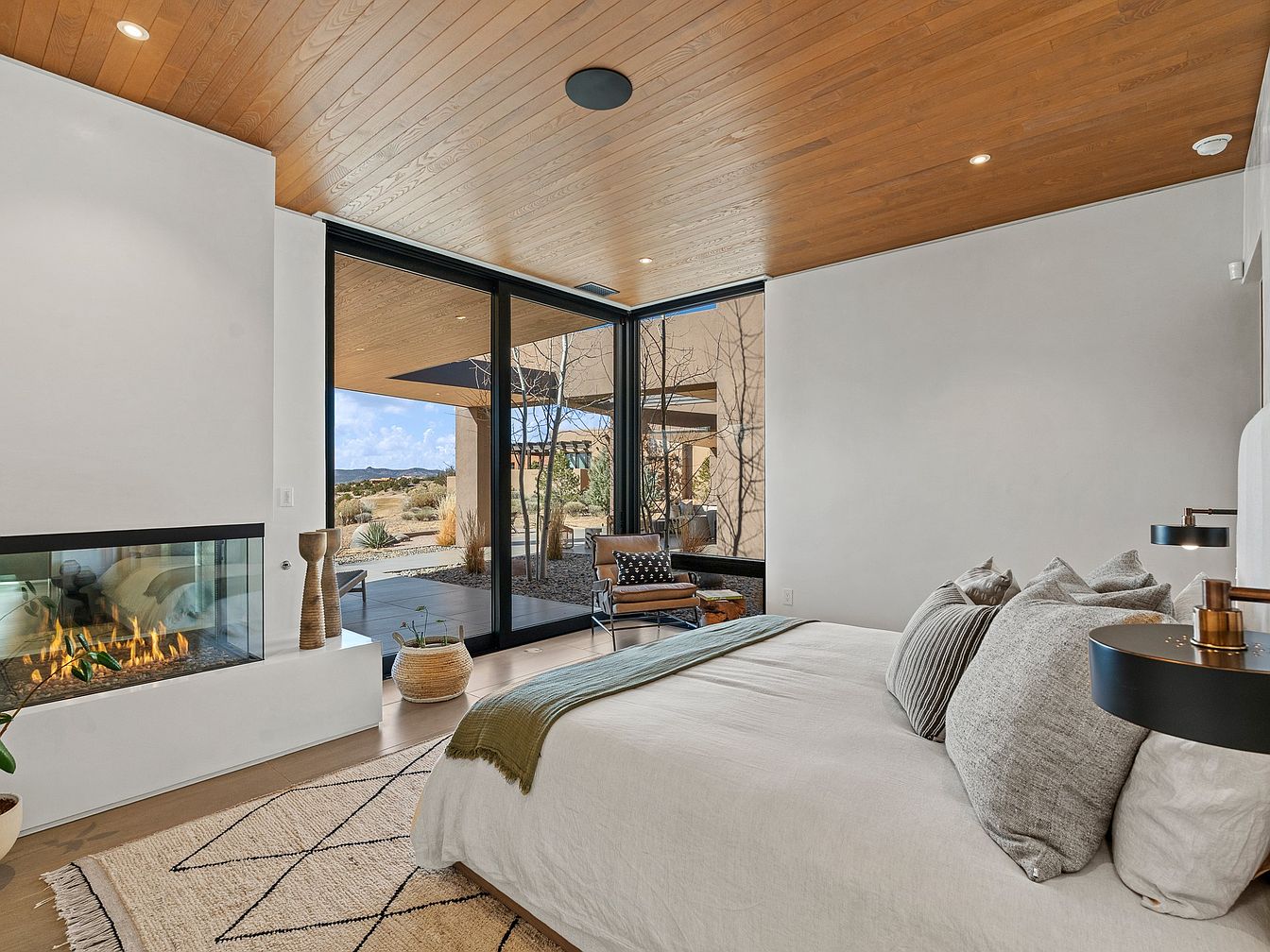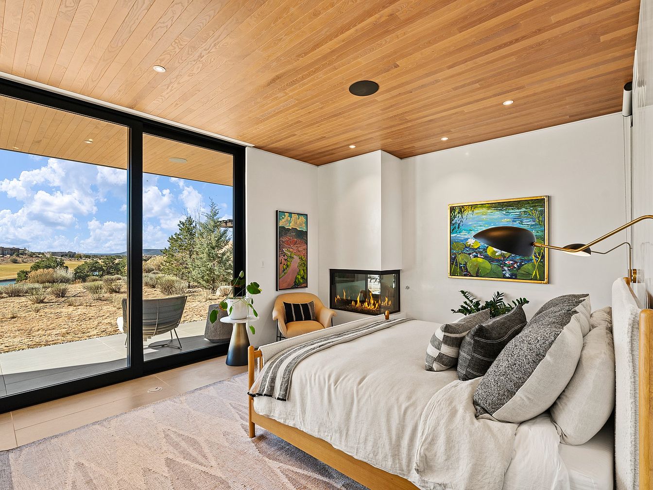 This modern bedroom features a harmonious blend of natural light and earthy tones. A large glass wall showcases serene outdoor views, connecting the interior with nature. Natural wood paneling on the ceiling adds warmth, while sleek white walls enhance the spaciousness. The bed, dressed in neutral linens and layered with textured pillows, provides comfort. An elegant black accent lamp and a small greenery plant bring an organic touch. A cozy reading nook, with a minimalist chair, complements the space. A stylish gas fireplace anchors one wall, adding a contemporary element, inviting relaxation and warmth.
