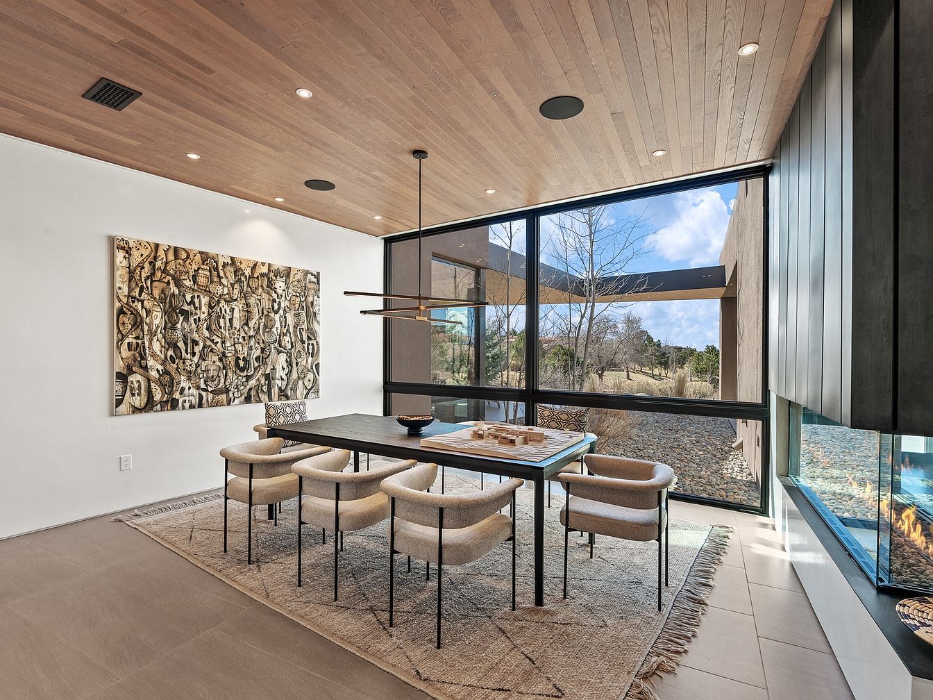 A stylish dining area featuring a long, rectangular wooden table surrounded by six modern upholstered chairs with rounded backs and slender black legs. The room is illuminated by recessed ceiling lights and a striking pendant light above the table. A large, abstract artwork in neutral tones adorns the wall, complementing the light wood ceiling and white walls. Expansive floor-to-ceiling windows flood the space with natural light, offering a view of the outdoor landscape, enhancing the open feel. The light beige flooring contrasts with a textured rug underneath the table, adding warmth and depth to the contemporary design.