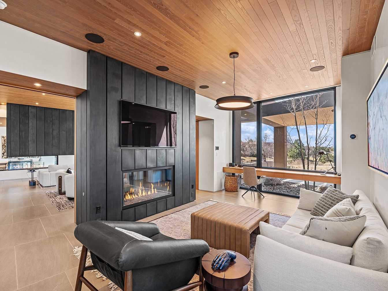 This modern living room features a striking blend of natural elements and contemporary design. A warm wooden ceiling contrasts with the sleek, dark wall housing a modern fireplace and flat-screen television. The furniture includes a comfortable white sectional couch adorned with decorative pillows, arranged around a minimalist coffee table. A cozy armchair complements the aesthetic, while the subtle rugs add softness. Expansive windows flood the space with natural light and offer views of the landscape outside, enhancing the indoor-outdoor connection. A stylish desk area balances function and design, showcasing clean lines and a neutral color palette.