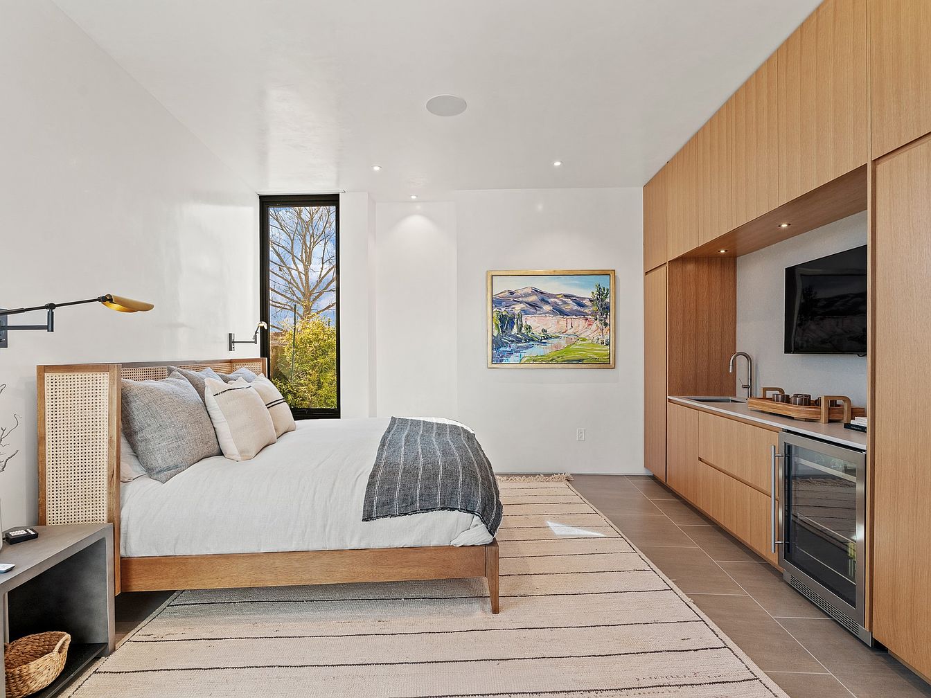 The space features a modern bedroom marked by minimalistic elegance. A wooden bed frame with woven headboard supports plush, layered pillows and a textured duvet. Adjacent, a sleek bedside table holds a stylish lamp. Natural light floods the room through a tall window, revealing a glimpse of trees outside, enhancing the serene atmosphere. The wall-mounted television complements the built-in cabinetry behind, showcasing consistent wood tones. A neutral color palette of whites and soft grays is accented by earthy textures. A cozy area rug adds warmth to the stone floor, creating an inviting and tranquil retreat.