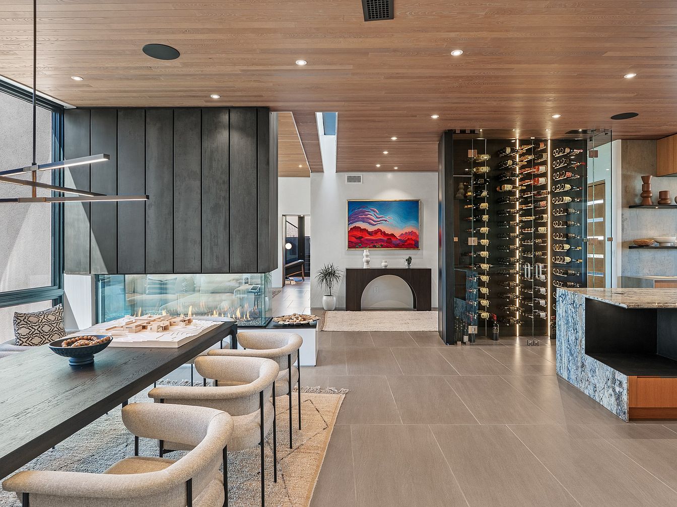 A sleek dining area features a long, dark wood table with soft, rounded chairs in a light fabric. Behind, a glass-enclosed fireplace creates a cozy ambiance, with flames visible through transparent panels. The ceiling showcases warm wooden planks, enhancing the modern feel. A wine cellar, framed in dark glass and metal, displays an impressive array of bottles, while nearby, artistic decor and ceramics add character. The walls combine textured concrete with smooth light surfaces, supporting vibrant artwork that introduces a splash of color. The overall arrangement promotes interaction, inviting gatherings in this contemporary space.