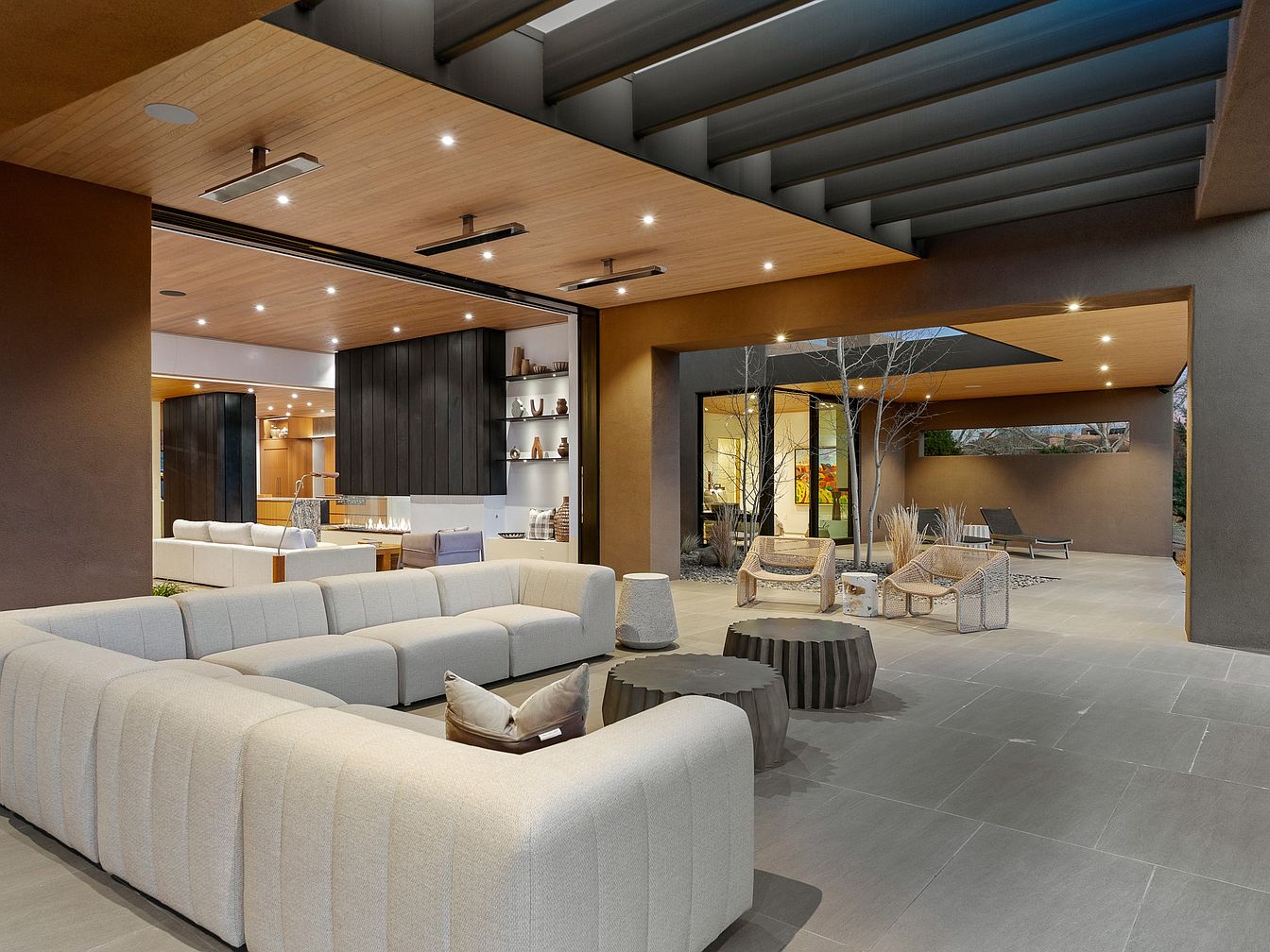 This outdoor lounge area showcases a modern aesthetic with a smooth, neutral color palette dominated by earthy tones. A sleek, stucco wall frames the space, highlighted by a transparent roof allowing natural light to flood in. Minimalist wooden furniture, featuring comfortable armchairs and a soft, lined sofa, invites relaxation. The circular metal table adds a contrasting element, while natural stones and desert grasses integrate the environment’s organic textures. Recessed lighting in the ceiling enhances the ambiance, creating a cozy atmosphere, perfect for outdoor gatherings. Expansive glass doors connect the lounge seamlessly to the interior spaces.