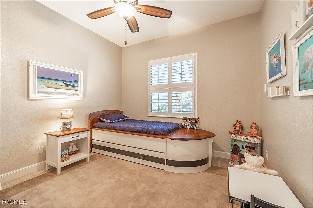 This cozy bedroom nook features a unique built-in bed with a wooden headboard, accented by a navy blue comforter. A matching nightstand with a lamp provides warm lighting, enhancing the inviting atmosphere. The walls are painted in soft beige, creating a calm backdrop, while large windows with white shutters allow natural light to flood the space. Decorative elements include framed ocean-themed artwork and playful doll displays, adding character. The plush carpet underfoot contributes to the comfort, while the ceiling fan above ensures a pleasant breeze, balancing aesthetic appeal with practical comfort for relaxation.