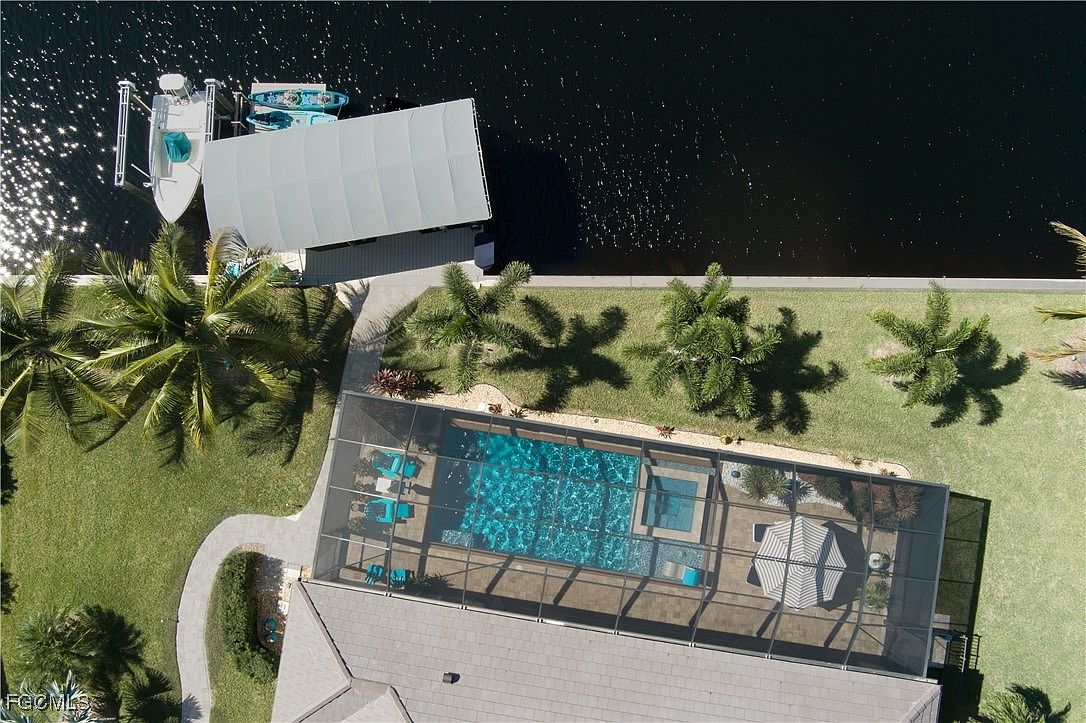 This image showcases a beautiful backyard featuring a shimmering pool encased in a screened enclosure, surrounded by elegant landscaping. The refreshing blue water contrasts with the tan pool deck and lush green grass, creating a vibrant atmosphere. Palm trees cast playful shadows on the ground, enhancing the tropical feel. A shaded umbrella and modern lounge chairs in turquoise invite relaxation. Adjacent, a boat shelter offers convenience for water enthusiasts, while the dark waters reflect sunlight, adding to the serene ambiance. This outdoor space balances leisure and nature seamlessly, ideal for gatherings or tranquil moments.
