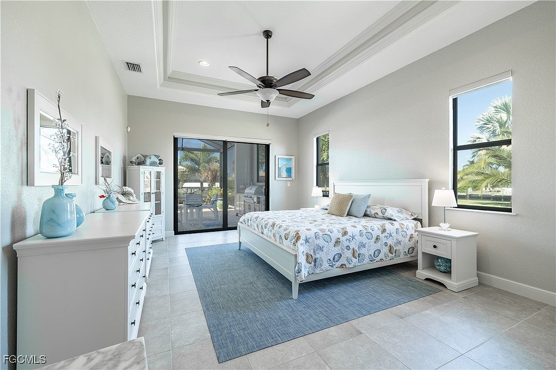 This serene bedroom features a spacious layout with a calming color palette of soft blues, whites, and grays. A large window offers a view of palm trees outside, enhancing the tranquil ambiance. The bed, adorned with a sea-themed patterned duvet, is complemented by bedside tables with lamps. A plush blue area rug adds warmth beneath. A white dresser and a glass-front cabinet provide storage while maintaining a light aesthetic. The ceiling has elegant crown molding and a ceiling fan, ensuring airflow and style. Natural light floods the room, creating an inviting and peaceful retreat.