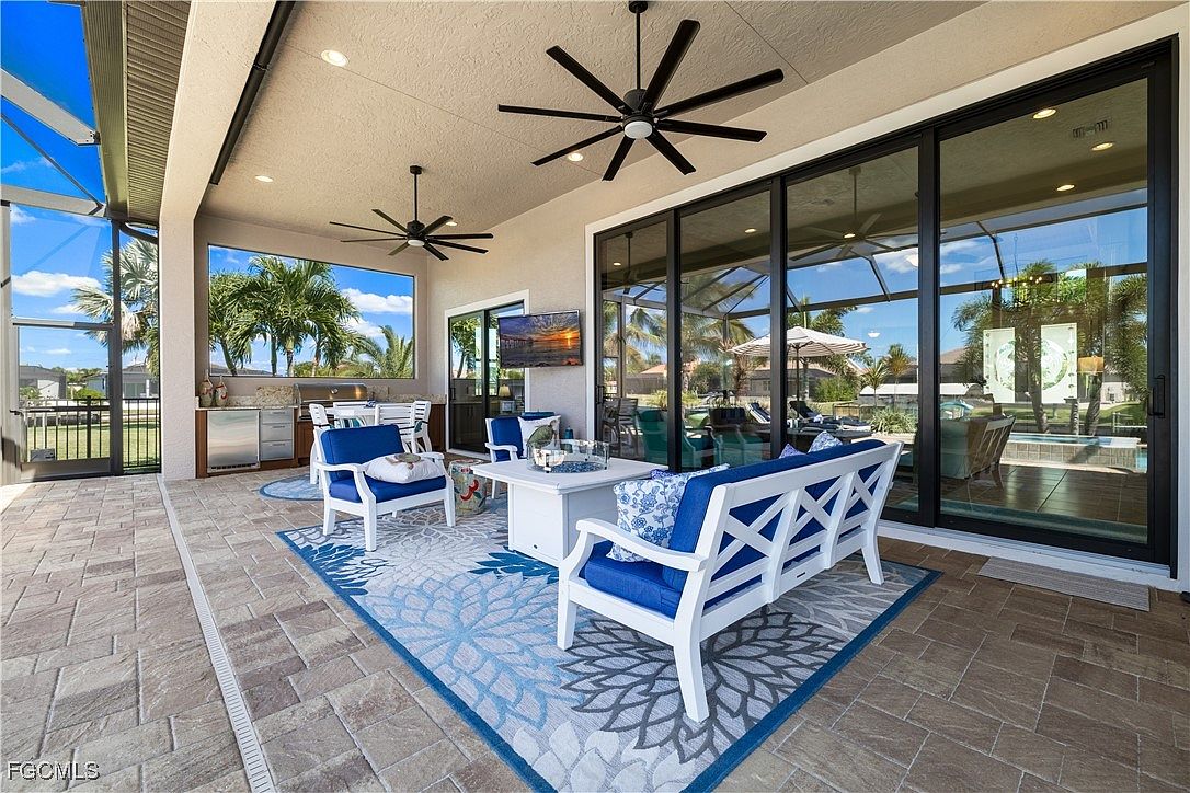 This spacious lanai features a blend of indoor and outdoor living. A large area rug with a floral design in soft blues and grays anchors the seating. White patio furniture, including a comfortable couch adorned with blue cushions and a sleek coffee table, creates an inviting atmosphere. Two ceiling fans circulate air above for comfort. Expansive glass doors offer seamless views of the lush yard and palm trees beyond. An outdoor kitchen is visible, equipped with stainless steel appliances. The overall aesthetic combines modern convenience with tropical charm, perfect for relaxation and entertaining.