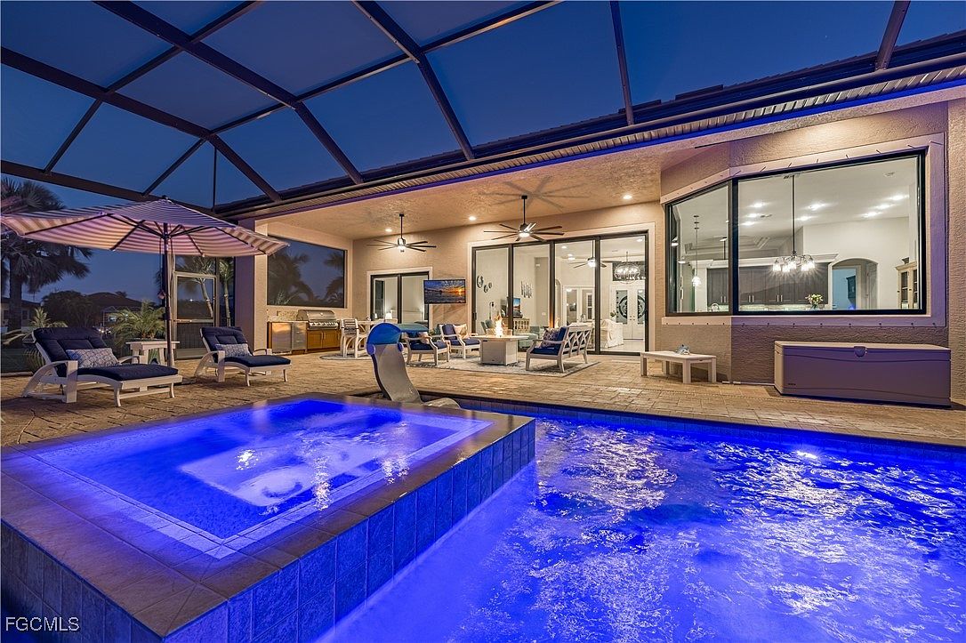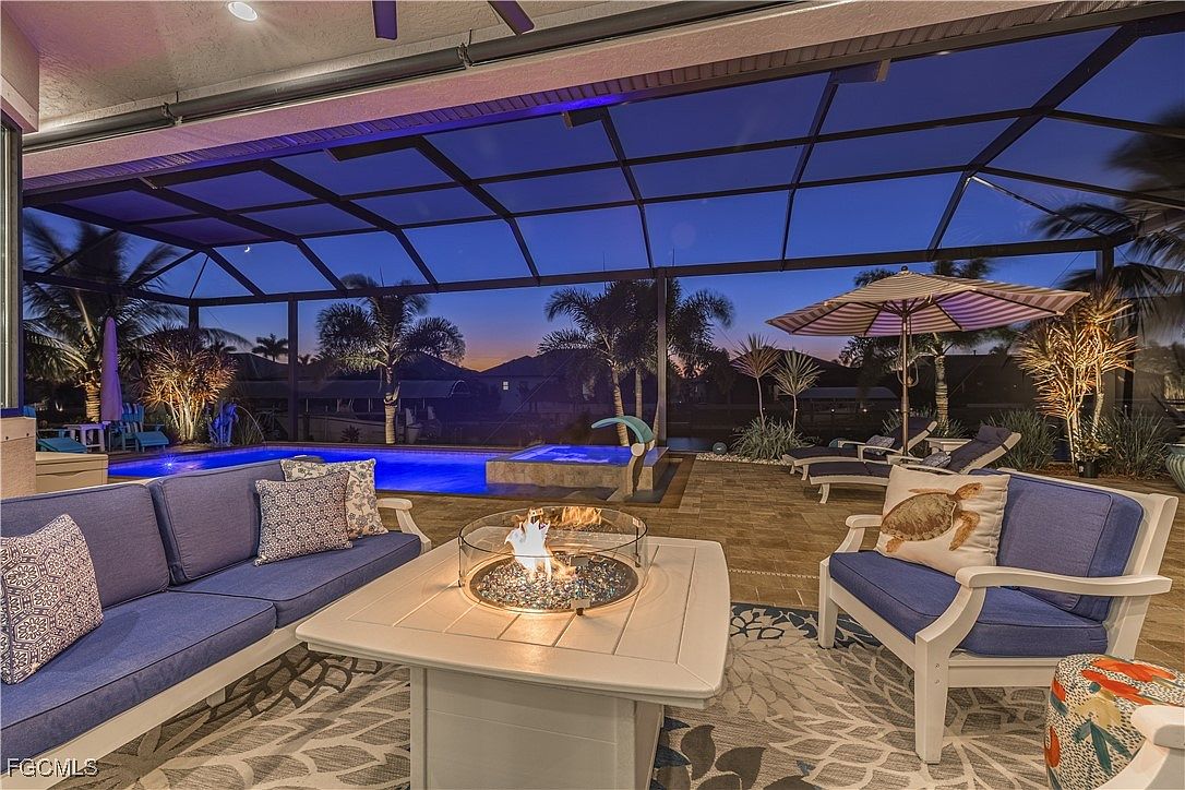 This outdoor patio features a relaxing ambiance, accentuated by a large, heated swimming pool shimmering with blue lights. The seating area comprises a modern sectional sofa adorned with vibrant blue cushions and decorative pillows, alongside a stylish fire pit that adds warmth and charm. Potted plants and palm trees enhance the tropical feel, while the soft, neutral-toned flooring complements the space beautifully. A large, elegant umbrella provides shade over a set of chaise lounges, perfect for soaking up the sunset views through expansive screens, creating a serene retreat that invites both relaxation and social gatherings.