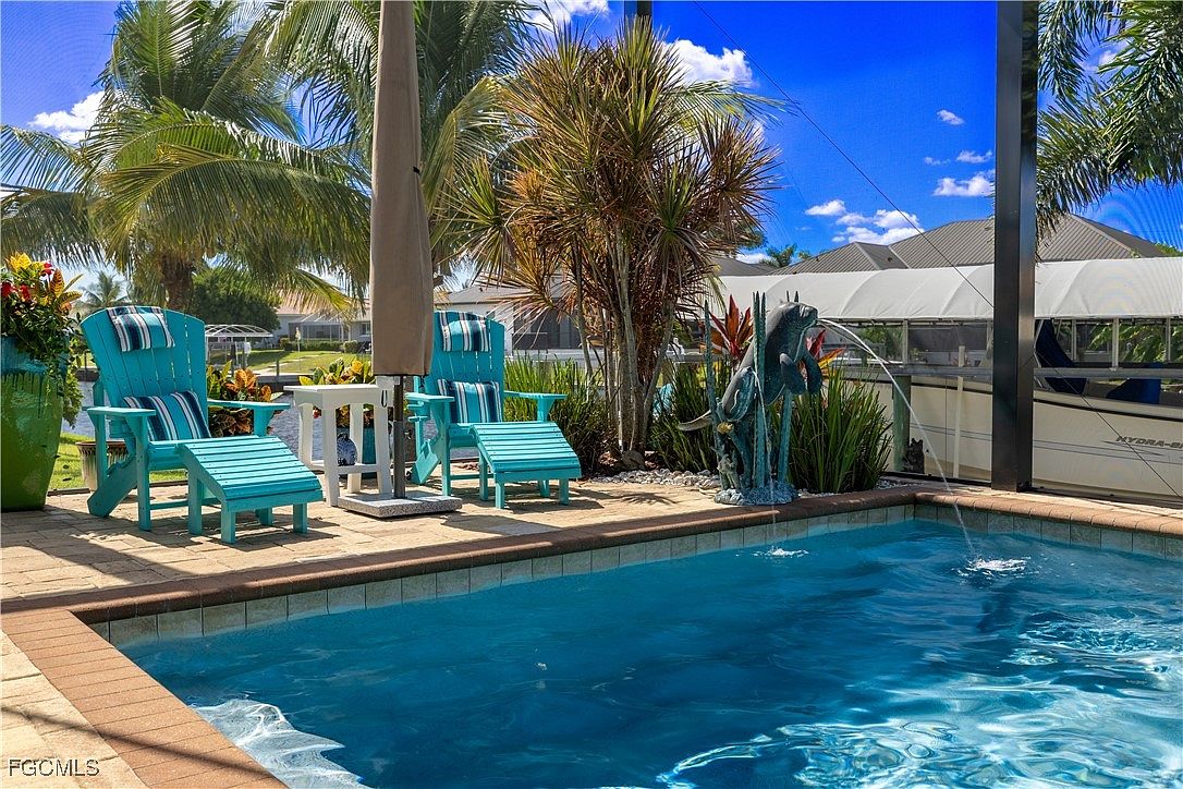 A vibrant poolside area showcases two turquoise lounge chairs and matching side table, inviting relaxation. Decorative pillows and a patio umbrella enhance comfort while providing shade. The pool glimmers with clear blue water, bordered by textured tiles. Lush greenery, including palm trees and colorful shrubs, surrounds the space, creating a tropical atmosphere. A whimsical fish fountain adds charm, with water gracefully flowing into the pool. The backdrop features a serene residential area and a glimpse of boats, enhancing the outdoor leisure vibe. Bright blue skies and soft clouds complete this idyllic retreat.