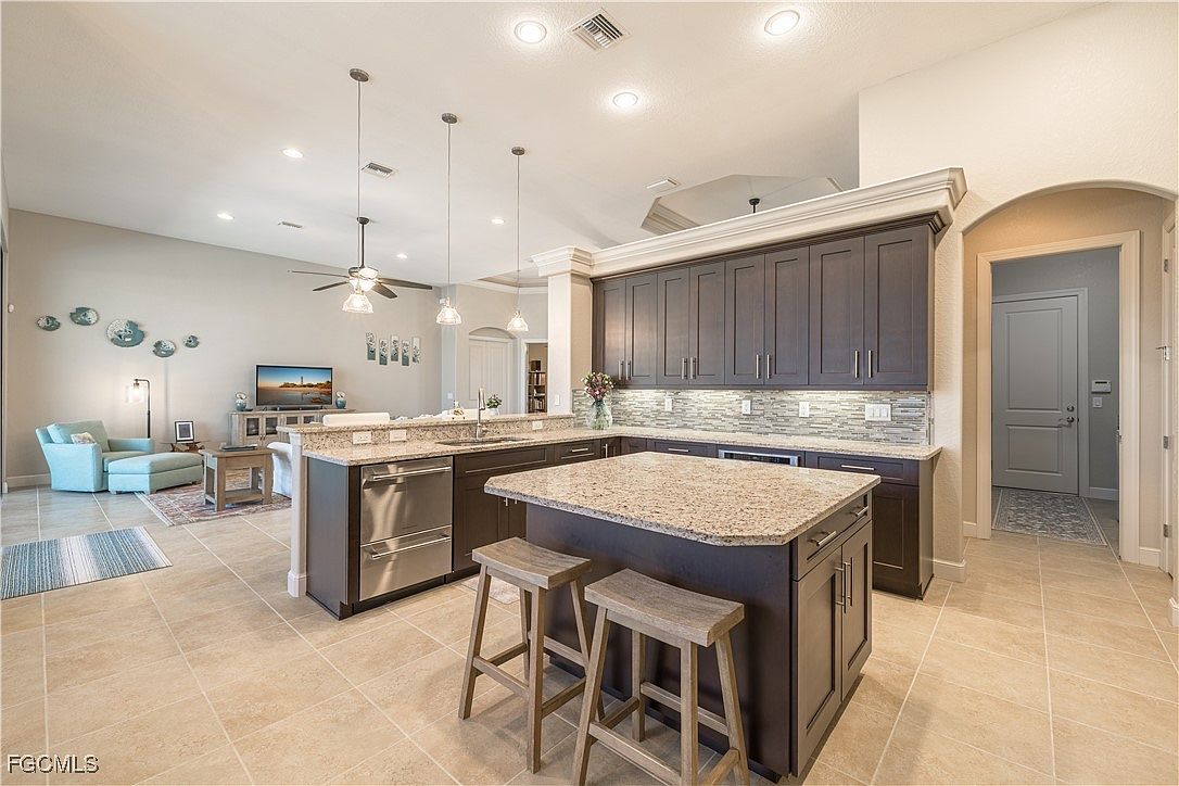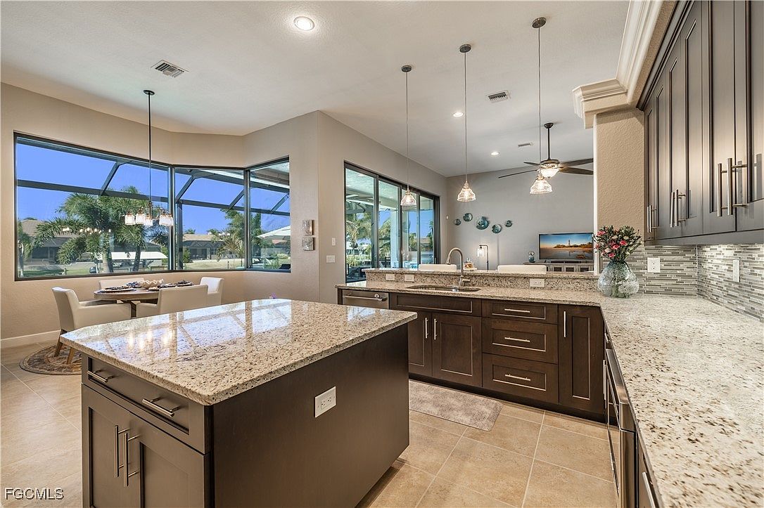 This modern kitchen features a spacious layout with rich, dark cabinetry and a large, polished granite island that contrasts elegantly with the lighter tile flooring. Recessed lighting, alongside stylish pendant lamps, illuminates the space, highlighting the seamless integration of function and style. Large windows allow natural light to flood in, showcasing views of the outdoors and extensive greenery beyond. The backsplash adds texture with its subtle mosaic pattern, complementing the cabinetry’s sleek lines. A casual dining area is visible, enhancing the inviting atmosphere, making this kitchen a perfect blend of practicality and warmth.
