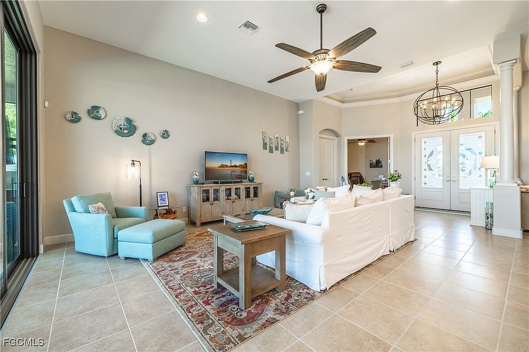 A bright living room features pristine tile flooring and an elegant open layout. Soft, neutral walls enhance the airy atmosphere, complemented by a white sectional sofa adorned with plush white cushions. A rustic wooden coffee table stands in the center, showcasing decorative items. A light blue accent chair adds a pop of color and comfort. The entertainment unit houses a flat-screen television and decorative plants, contributing to a cozy vibe. Wall decor includes shades of green and blue, enhancing the room’s tranquility. Large double doors invite natural light, creating a welcoming space for relaxation and gatherings.