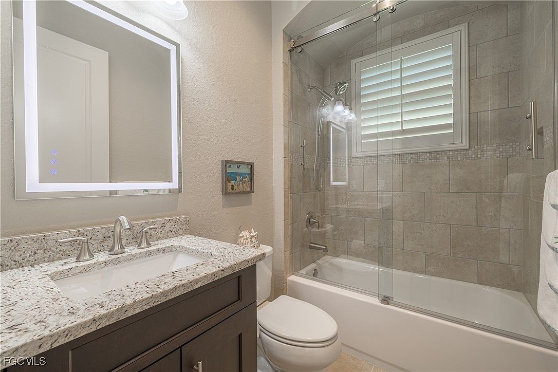 A modern bathroom featuring a sleek design. The tiled walls are adorned with neutral beige tones, giving a clean aesthetic. A contemporary lighted mirror is mounted above a dual sink vanity with a granite countertop, complementing dark wooden cabinetry. The shower area includes glass doors, showcasing a minimalist showerhead and stylish fixtures. Natural light filters through a louvered window, enhancing the space’s brightness. A framed artwork adds a subtle touch of personal style, while neatly placed towels and decor maintain a tidy appearance. Overall, the bathroom blends functionality with contemporary elegance.