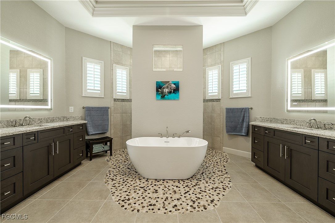This spacious bathroom features a modern freestanding bathtub at its center, surrounded by an elegant pebble-patterned floor that adds a natural element. Dark wooden cabinetry with sleek hardware provides ample storage on either side, complemented by light granite countertops. The walls are painted in a soft, neutral tone, enhancing the airy feel. Natural light filters through the plantation-style shutters of several windows, illuminating the space. Illuminated mirrors above each sink add a contemporary touch. A vibrant aquatic-themed artwork adorns the wall, creating a focal point and bringing a splash of color to the serene environment.