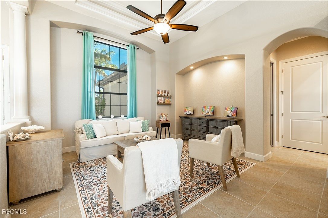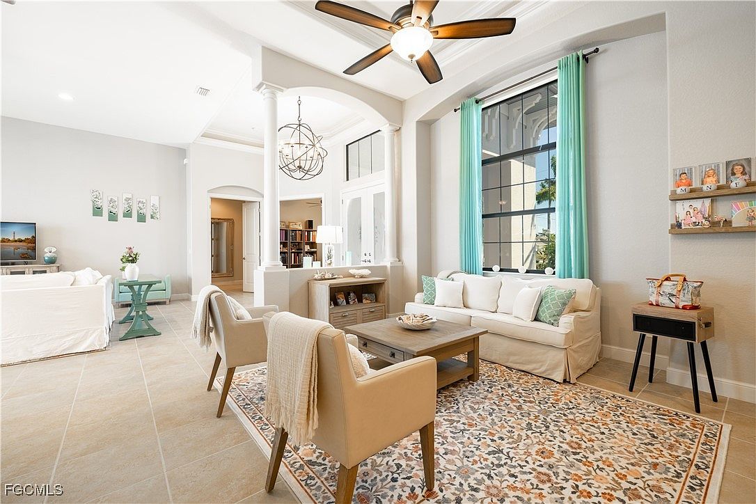 This living room showcases a spacious and airy layout, characterized by tall ceilings and large windows, allowing natural light to flood the space. The color scheme features soft neutrals with splashes of pastel green in the curtains and decorative pillows. A comfortable white sofa is paired with two beige armchairs, positioned around a wooden coffee table that sits atop a patterned area rug, adding warmth to the tile floor. Architectural details include decorative columns and a modern pendant light fixture, enhancing the inviting atmosphere. A subtle display of personal items and art adds a curated touch.